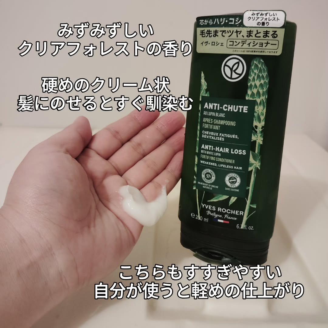 シャンプーはジェルみたいなテクスチャー!! 天然由来成分94%配合🌿 コンディショナーはなめらかなテクスチャーでノンシリコーン◎ 天然由来成分97%配合🌿 まとまるような使用感でした!! みずみずしいクリアフォレストの香り🌳 切れ毛や枝毛を防ぐホワイトルーピン*¹ 地肌を柔軟にし、髪にハリコシを与えるオーガニックアガベ*²を配合✨
