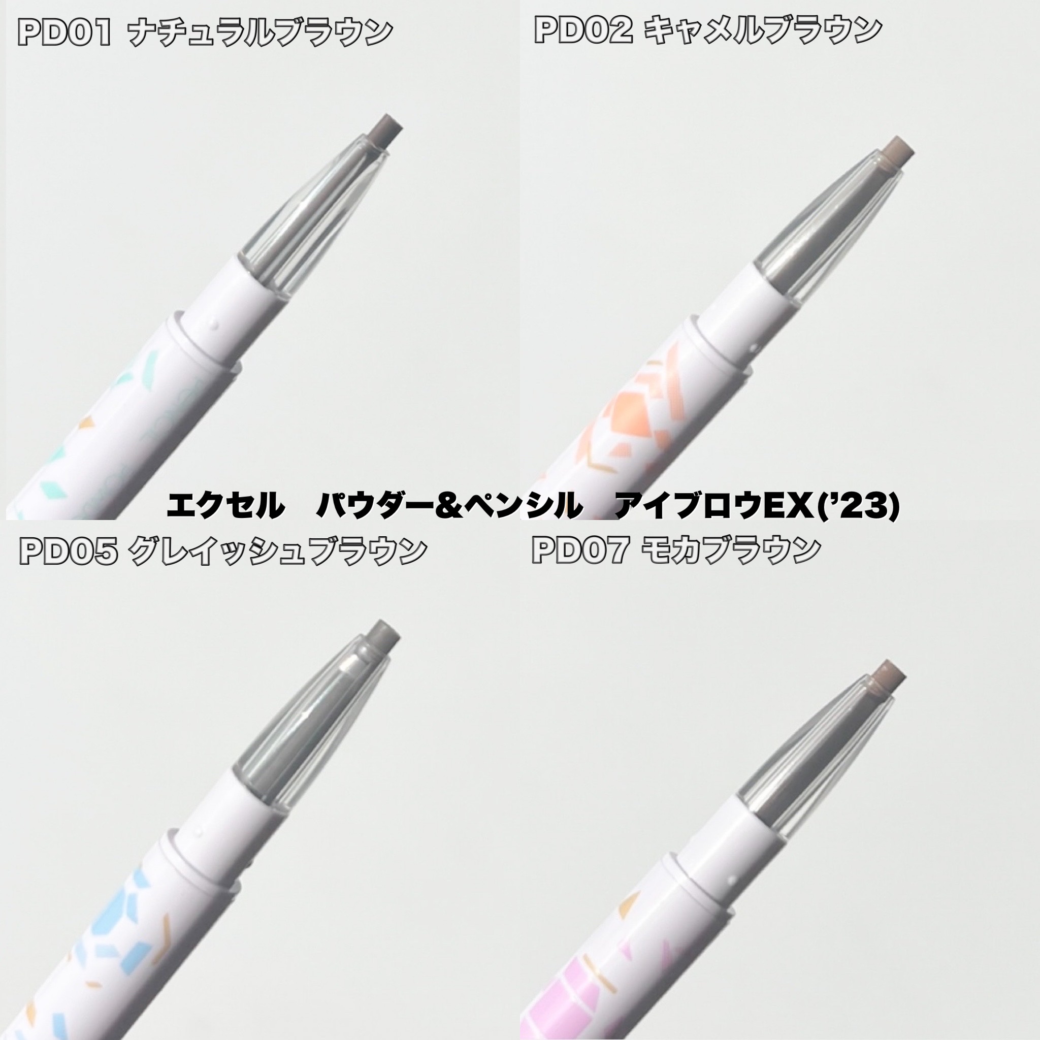 excelパウダー&ペンシル アイブロウEXPD01'23 ナチュラルブラウンPD02'23 キャメルブラウンPD05'23 グレイッシュブラウンPD07'23 モカブラウン excelの大人気アイブロウペンシルに限定パッケージデザインが遂に発売されます👏👏 お洒落な近代的な絵柄なので限定物好きさんにはたまらないと思います!✨