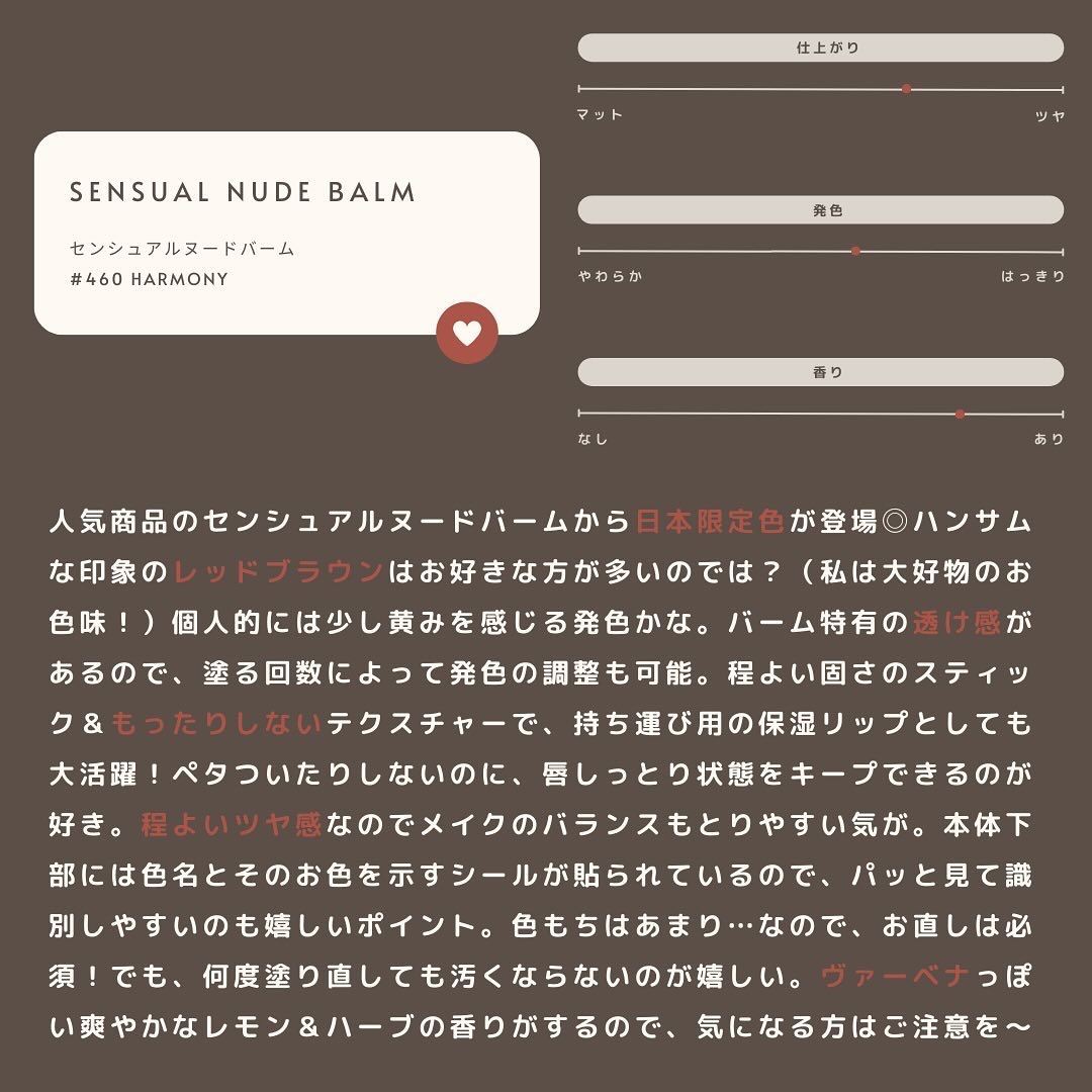 HERAセンシュアルヌードバーム460HERMONY日本限定日本限定の#460ハーモニーを購入しました!バームだけどべたつきなく使用できてダマにならず、保湿もしっかりされます◎色も1度塗りだとほんのりカラーですが、2度塗り3度塗りで印象を変え...