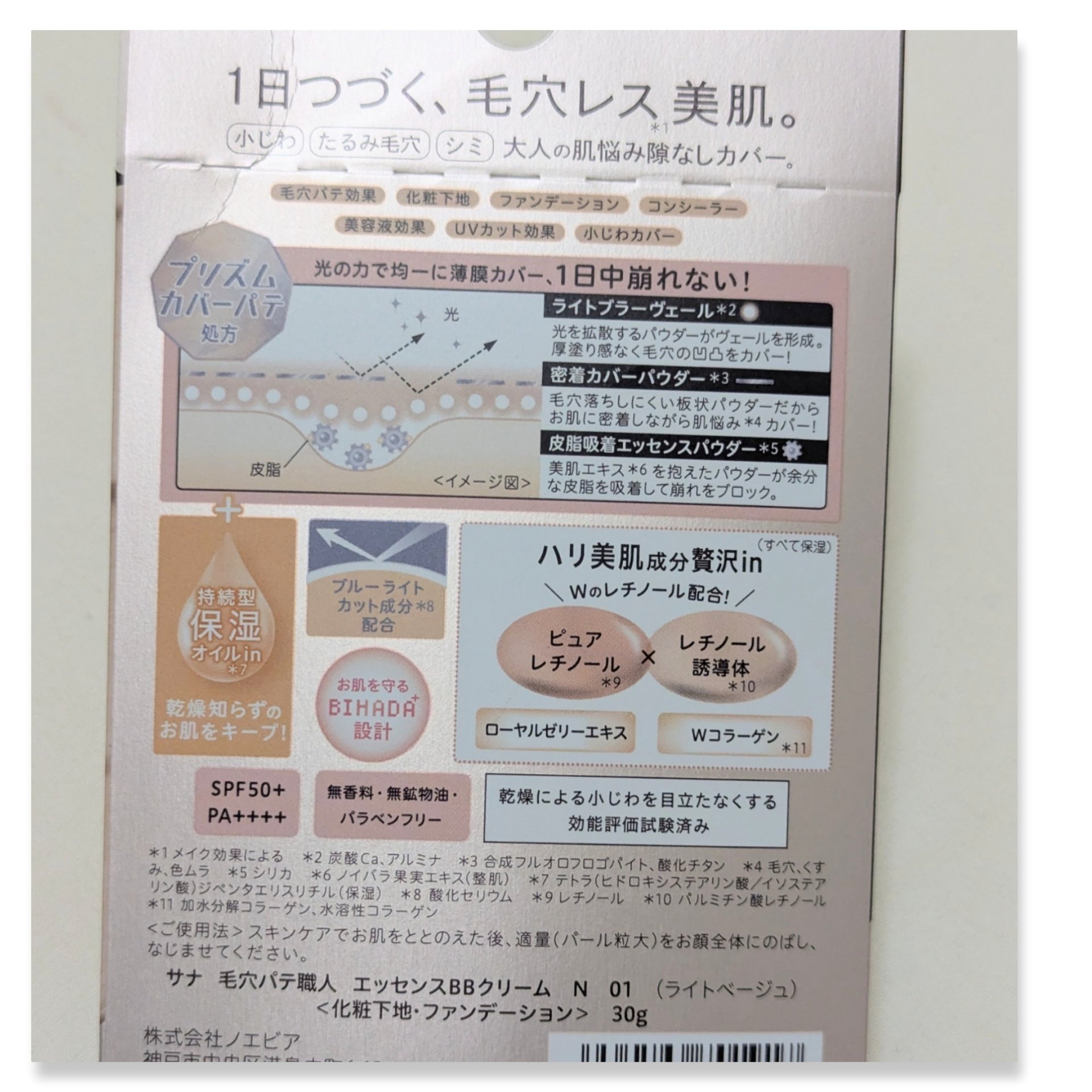 これひとつで秒速毛穴レス!!#毛穴パテ職人#エッセンスBBクリームN01ライトベージュオトナのための贅沢うるおいBB。毛穴の凹凸やしわに瞬間密着!夕方まで崩れないハリ・美肌成分のレチノールをW配合。さらに持続型保湿オイルin。空気中の水分を取り込み、うるおいを閉じ込めてくれる。光の力で薄膜均一カバー!!1日中毛穴崩れをブロック✨ブルーライトもカットしてくれてSPF50+PA++++厚塗り感もなく、スルッと仕上げることができカバー力もしっかりあります。お肌にも負担が少なくて、安心して使えます。ライトベージュを購入しましたが、結構しっかり明るめ✨❤️✨カバー力の高いBBって、暗くなるもの多いけど、明るめ派さんにはこのカラーはオススメ。お手頃価格で、結構気に入りました。