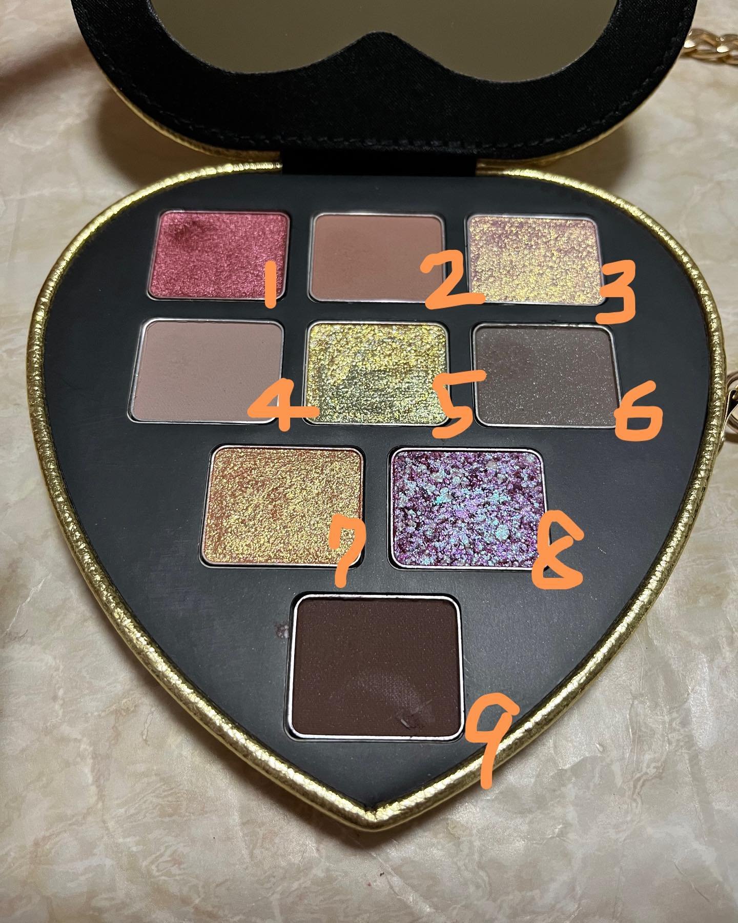右下アイホール 上段真ん中二重幅より広く 左下二重幅よりせまく 左上目頭 上段真ん中のサテントープがやっぱかわいくて好きだなぁ😆❤️ この赤ほんとかわいくて好きなんだなぁ😜✨ 目元がスモーキーな時に結構出番が多い😁 ラメ入り赤がかわいいグロストアンドファウンド😍 華やかになる❤️