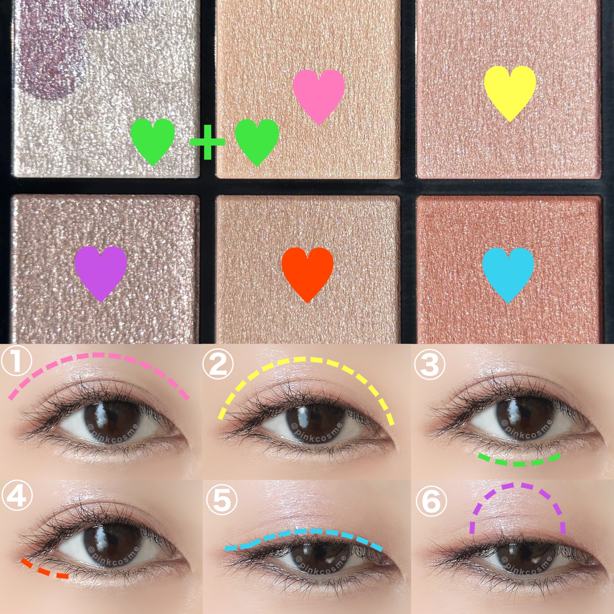 目元のみならず、眉や頬など、好きなパーツに使えるマルチパレットです♡ ラメ2色はやや湿度のあるしっとり感、他4色はマットで柔かな粉質。 私にはオレンジ味の強い発色だったので、ライナー風にとにかく淡く、小面積のアクセントとして取り入れてみました! 得意な青みと重ね塗りしつつ、季節感あるお洒落な仕上がりに♡ "A"の左上のラメはベースに青みピンクっぽさを感じます◎