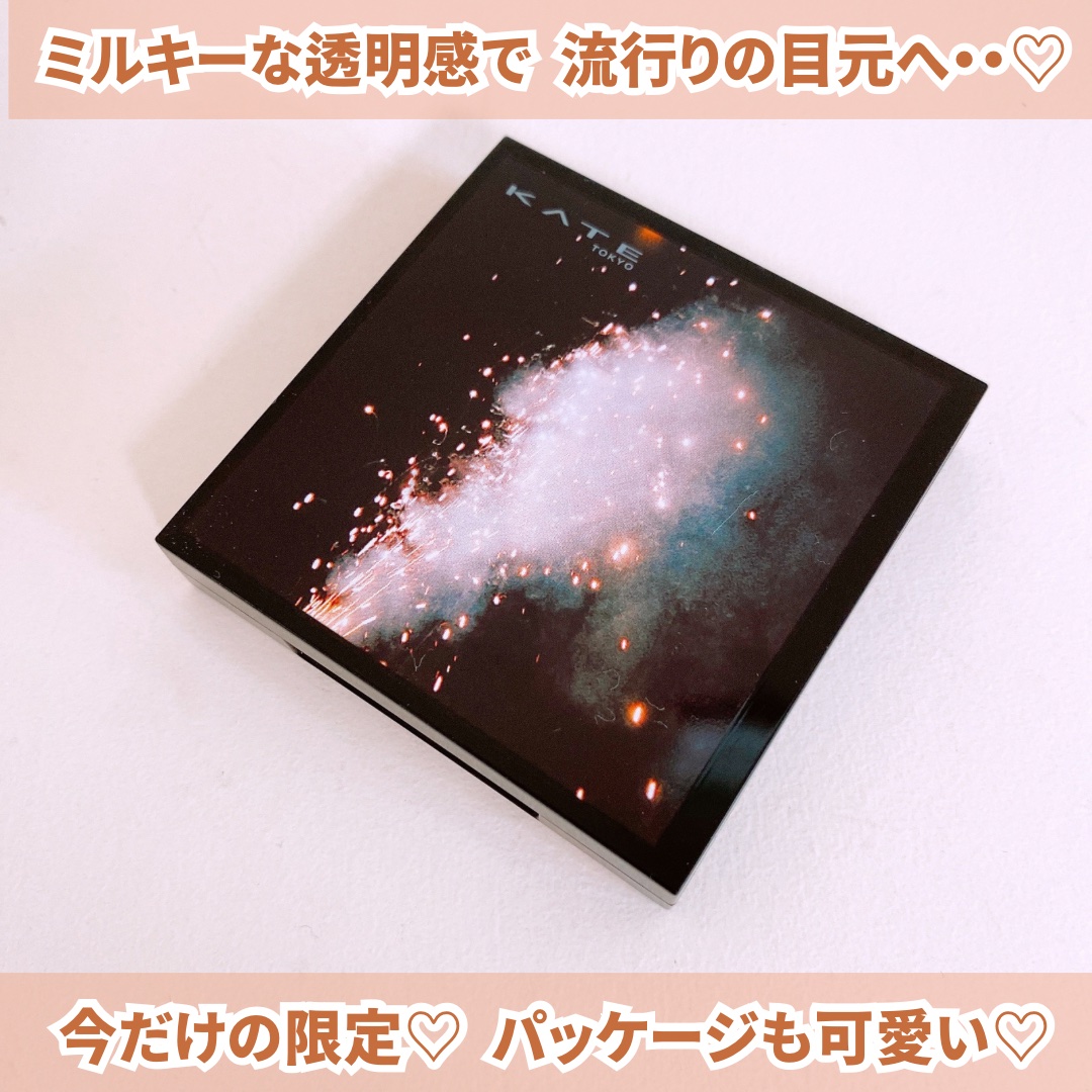 影感のないミルキーカラー×ソフト質感で目元・眉・頬などにミルキー感をちょい足しできるマルチな4色パレット! 肌に溶け込むようになじんでふわっと発色するのが特徴です! そのまま使っても可愛いですが、ふんわり発色のニュアンスカラーなので手持ちの他のアイシャドウにひらめくままに自由にちょい足しするのも楽しい♡ 重ねるとミルキー感が足されて儚げ感が増して可愛いです♡ 影感のないミルキーなカラーだから涙袋メイクに使用するのもおすすめです! ルールに縛られないKATEらしいステキなアイテム♡ どう使うか、どのコスメと合わせるか考える時間がめちゃくちゃ楽しかったです! 限定パッケージのデザインもステキ!
