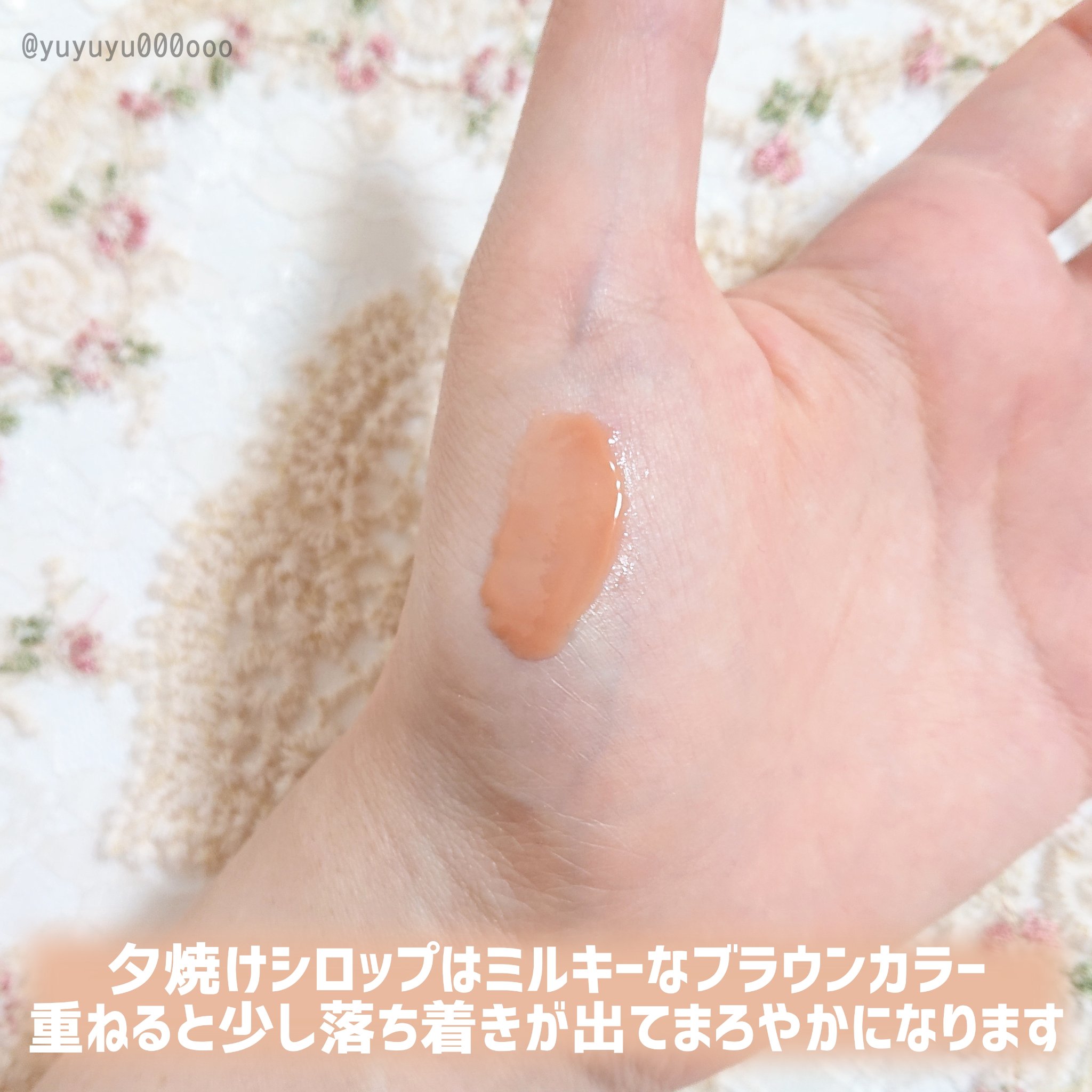 うるっとした艶のでるグロスです。 肉厚な水ツヤ感を与えてくれるのでぷっくり見せたい方にぴったりだと思います。 お色はミルキーなブラウン系で、スウォッチでは厚めに塗っているのである程度濃く見えますが、実際はもう少し薄く塗るのでこれ一本だとかなりナチュラルです。 スパチュラタイプなのがとても好感触で、重ねる用としても使えるグロスでこの形状なのは有り難いなと🥺💕 白みもほんのりあるブラウンなので、パキっとした赤リップ等に重ねるとほんのりと落ち着きが出て馴染みやすくなります。 夕焼けシロップという名前もとても可愛いです🌇 限定アイテムなのでお早めにチェックしてみてください🙌✨