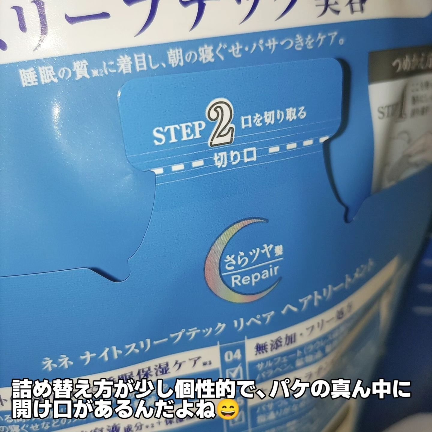 NeNeNightネネナイトスリープテックリペアシャンプー/トリートメント詰め替え各1100円(税込)リピート購入です(((o(*゚▽゚*)o)))案件で使用機会をいただいたのがきっかけで、好きになりました(๑♡∀♡๑)とても自分に合っています✨✨❤ネネナイトは、夜の摩擦ダメージ(睡眠中の枕等による髪ダメージ)と睡眠の質(睡眠環境)に着目したスリープテック睡眠美髪のナイトケアブランドです❤✨製品の90パーセント以上をナイト美容成分➕保湿成分で構成され、サルフェート・パラベン・鉱物油・動物実験フリー✨ナイトアロマの香りも癒されて好きです😘シャンプーがラベンダーアロマ、トリートメントがカモミールアロマの香り💜髪の摩擦ケアで、翌朝のまとまりも良くなるのでスタイリングがとても楽です😍サラツヤ髪になれてお気に入り😍桜バージョン?が販売されていたけどもう売ってないですね💦買っておけばよかったです😭ちなみに私の髪質はブリーチカラー繰り返しハイダメージ、細く柔らかい猫っ毛で癖毛です💦ブリーチのダメージで今は切れ毛もありますが、ネネナイトにしてからはダメージも最小限に感じます💫✨