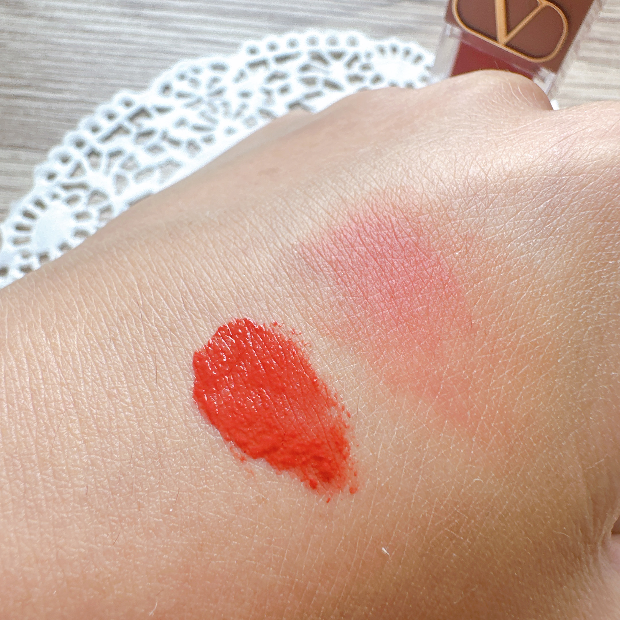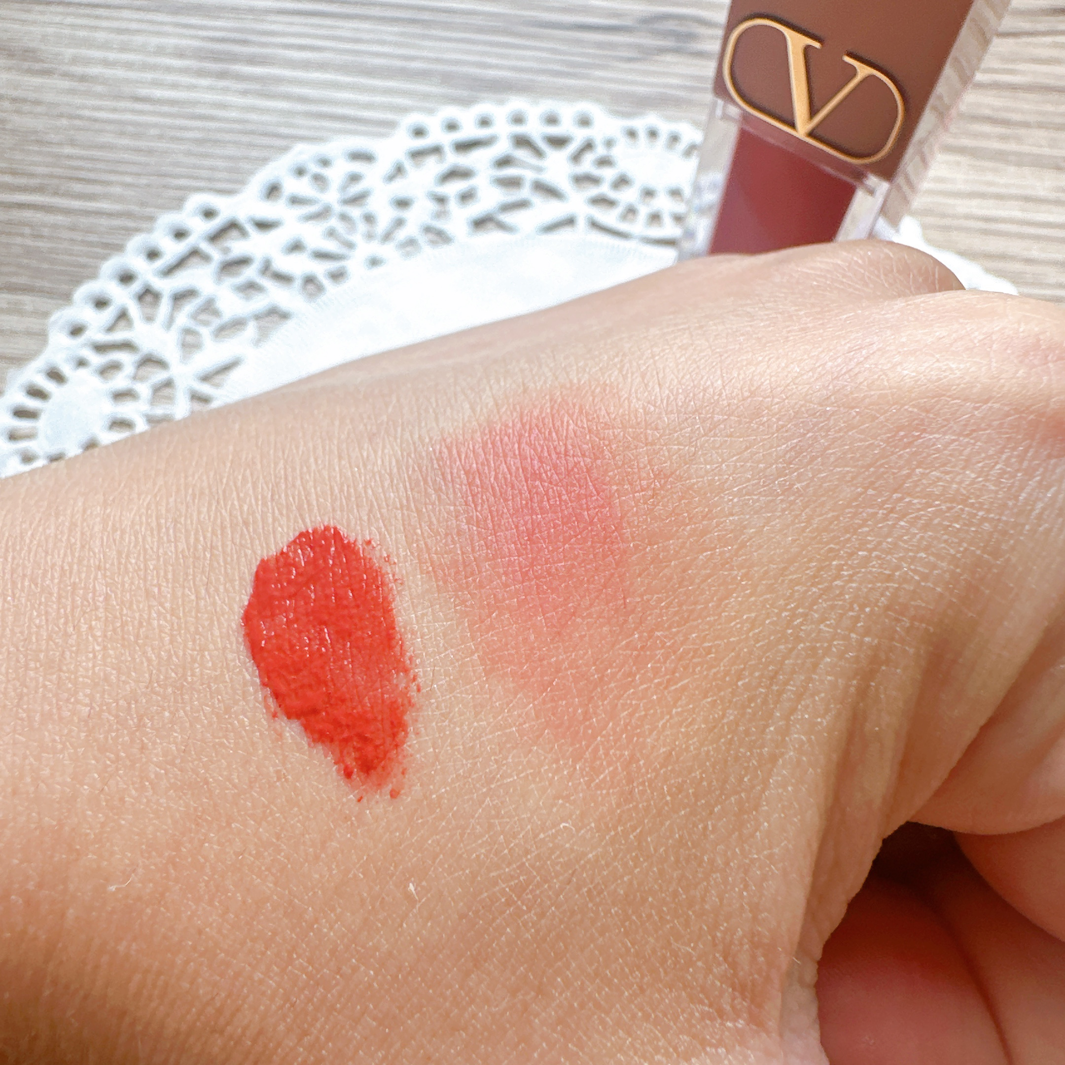 ヴァレンティノ ビューティのチーク&リップです◎ マットタイプのもので、すぐに色が付いてしまうので少量ずつ付けていく必要があります。 チークは特に一気に頬に乗せると薄くできないので手の甲に乗せて少し馴染ませてから少しずつ頬に乗せるようにして使います。 リップとして使うと少し乾燥して皮むけが気になりました。