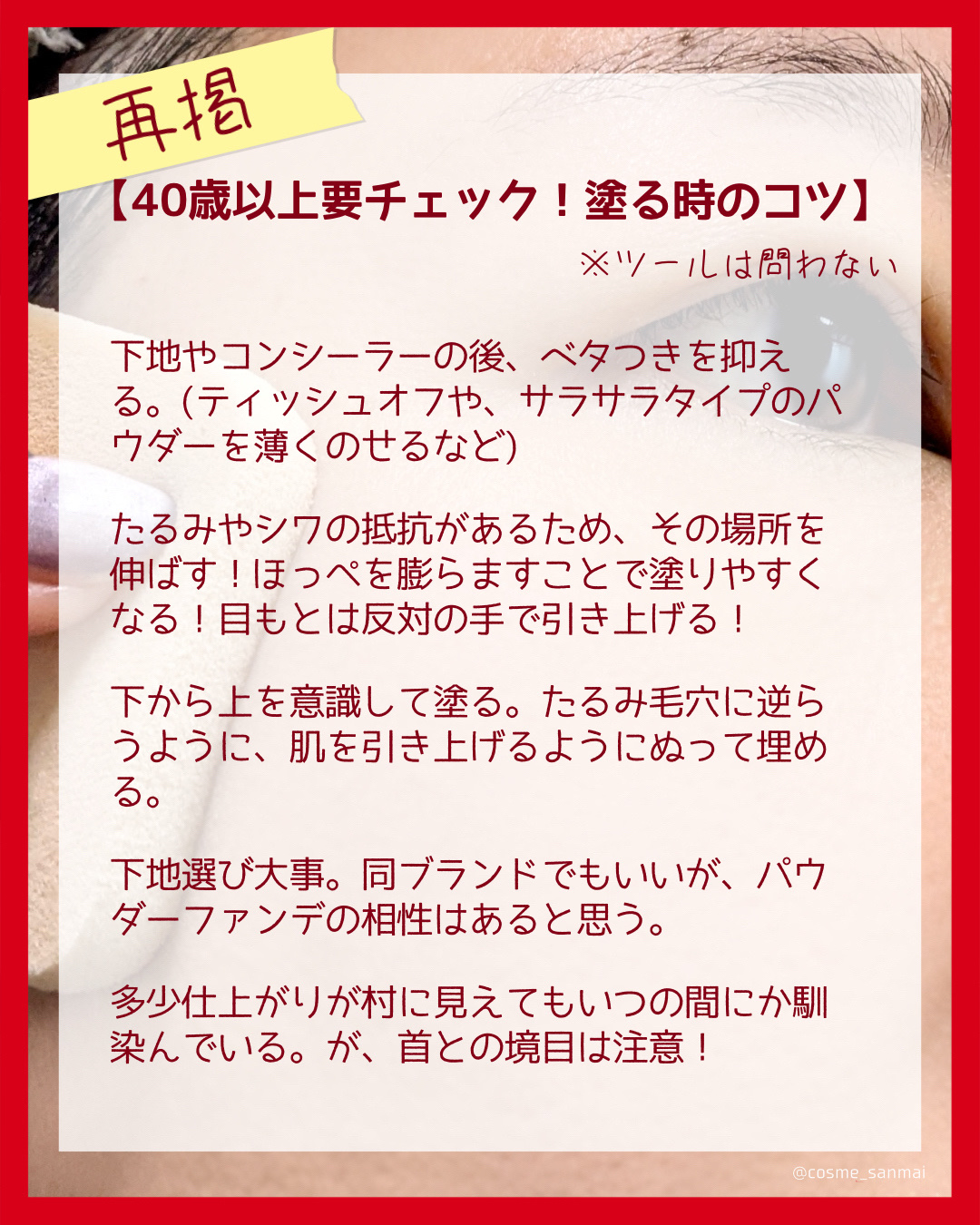 コンシーラーの後、パウダーファンデをつける前に先にルースパウダー又はプレストパウダーを仕込んでおきます。 ルースパウダーのお粉がコンシーラーを固定してプライマーの余分なベタつきを抑えてくれます。 そこでパウダーファンデをつければコンシーラーがヨレずにパウダーファンデのムラ付きも防いでくれます。