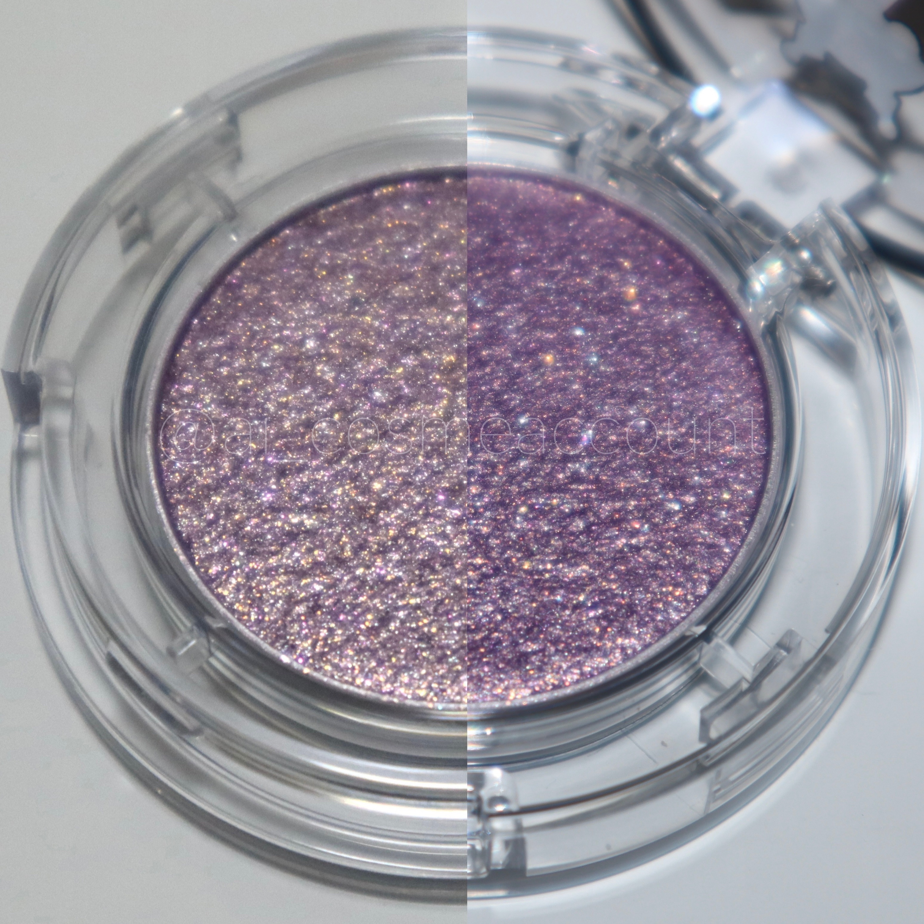 パープル系ですがそこまで色味がでるカラーではないです パープルが苦手でも使いやすそうです 少し偏光ラメみたいなカラー 色味自体が落ち着いているのでラメが苦手でも取り入れやすい印象です スウォッチは3枚目はそのままの状態,4枚目はラメの色味が分かるようにあえてぼかして撮影しています 単色使いも可愛いですが色味のあるアイシャドウと組み合わせると使いやすいと思います 薄く広げてベースにしたり、トッパーとしても使えます 湿気が多い時などはアイシャドウベースを先に塗布しておくとラメがとれにくくなります 既存のマルチグリッターカラーのようなパキっと発色ではないです