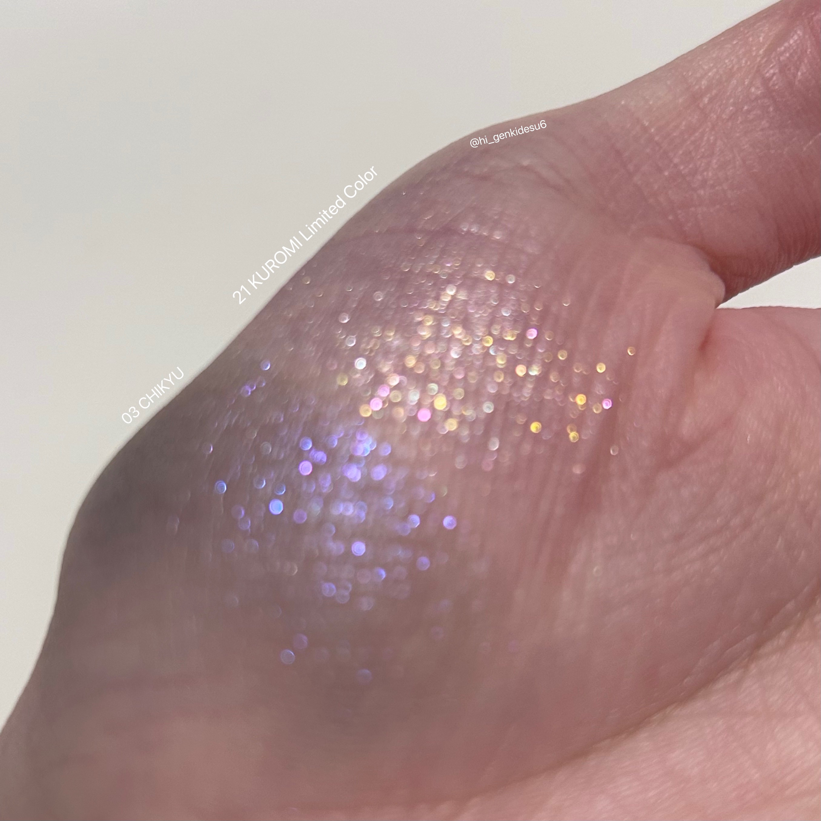 03 CHIKYU Limited Edition (限定パッケージ) ネイビーのベースカラーに青と紫グリッター。 21 KUROMI Limited Color (限定色) パープルのベースカラーにゴールドラメ。 “マルチ”グリッターカラーと言う名前通り、目・頬・口などマルチに使えます。