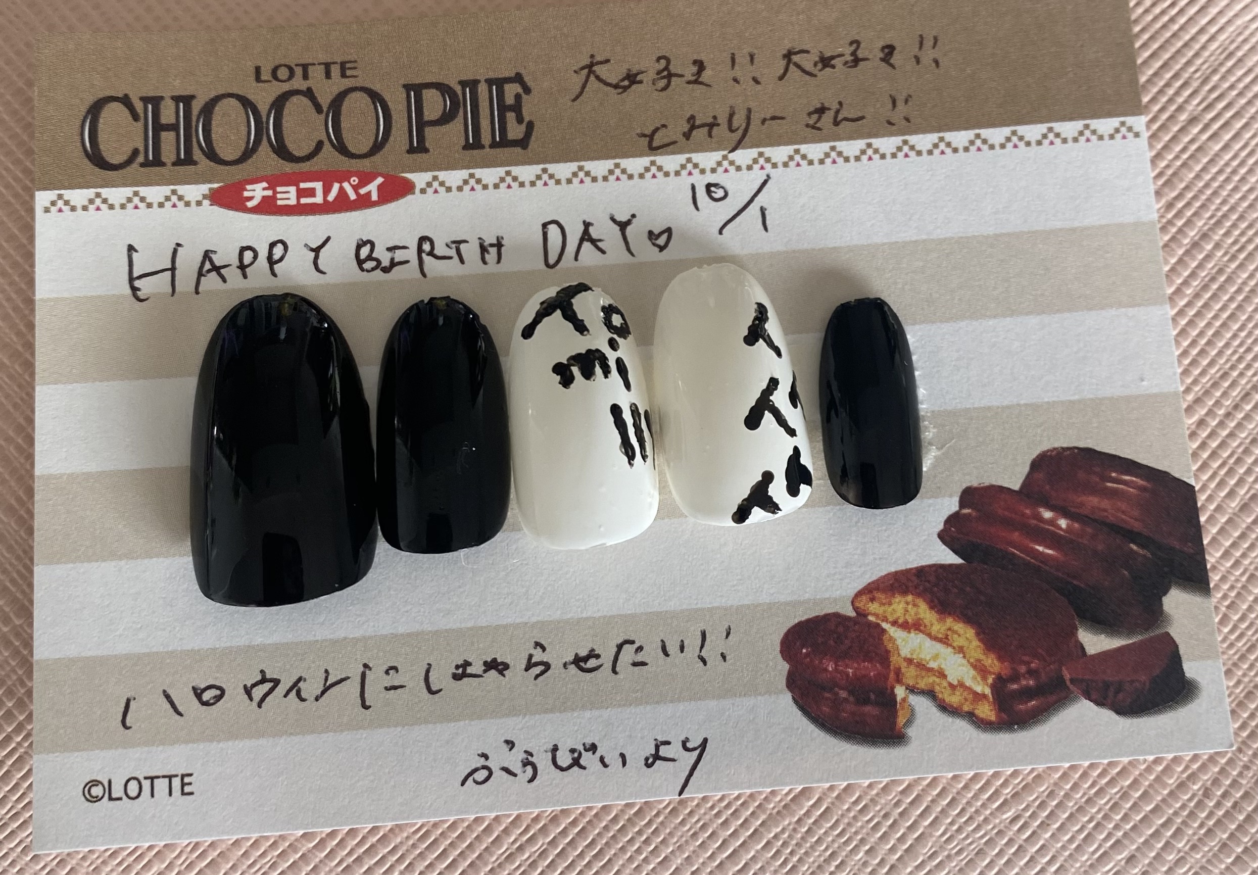 そして「T」と「Tomilly」のロゴを描いたら完成👏 色合いもデザインもハロウィンにもピッタリ🍬👻🎃 ロックな感じにもシンプルな感じにも似合ってしまうとみりーさん(˶> <˶)♡ ぜひ真似して欲しいですー❣️