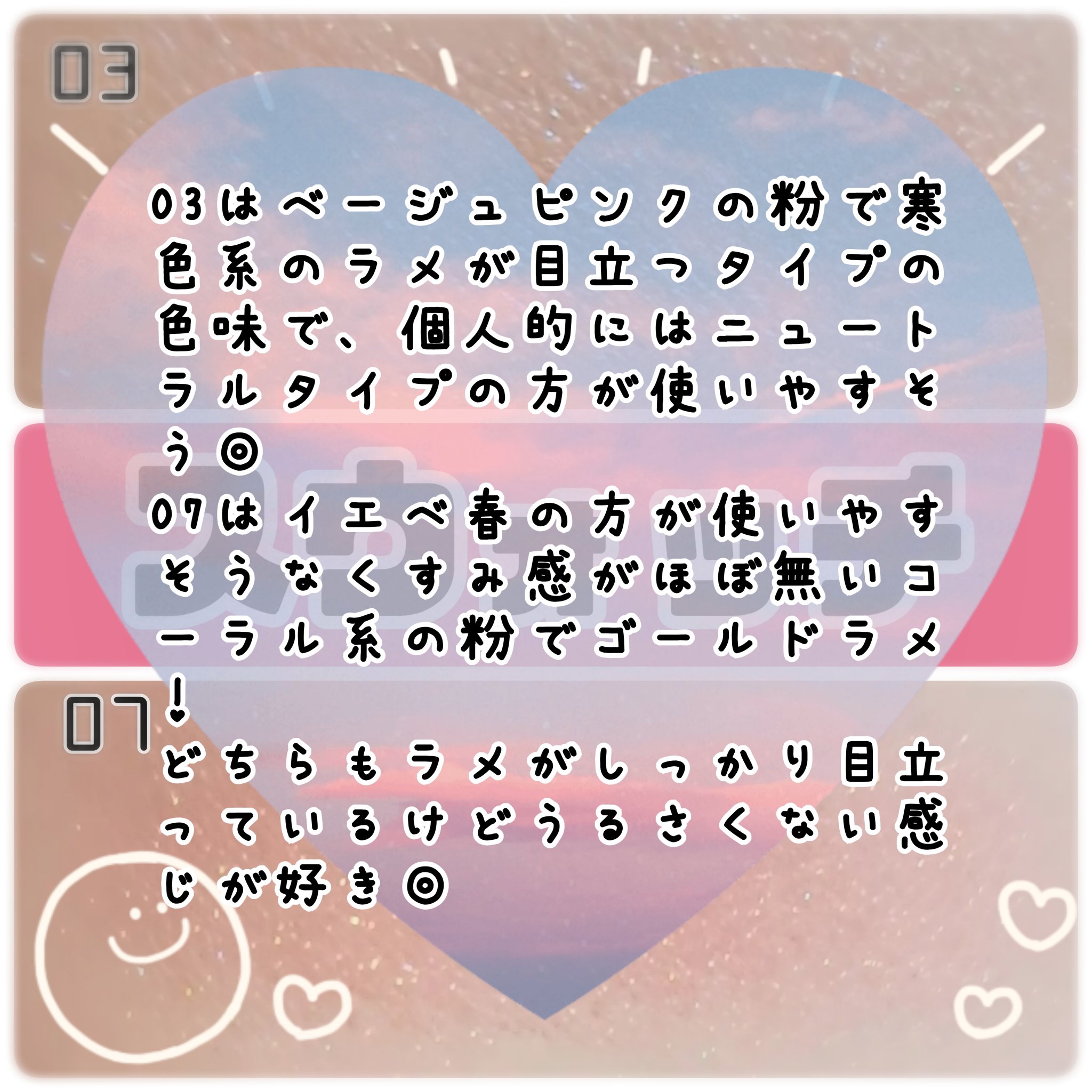 プリズムイルミネーターというだけあってラメ感がけっこうしっかりめに出ます◎ 03はベージュピンクで青ラメなど寒色系のラメ目立つので、パーソナルカラーがニュートラルの方が使いやすそうな色味です✴️ 07はザ・イエベ春!みたいなコーラル系の色味です💖イエベ春の方に向いていると思いますが、1stがイエベの方なら使いやすい色味だと思います✊