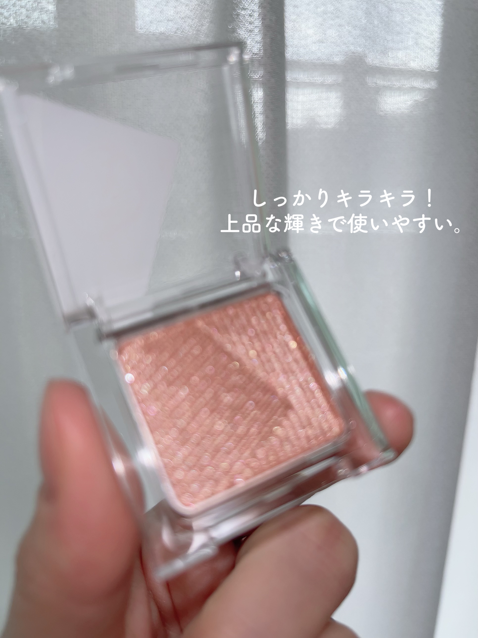 ミニサイズなのとベースカラーとしても、最後に足すラメとしても使えるし色味によっては二重幅に濃く乗せたり、締め色代わりにも使用できるので使いきりやすい印象でした。 ナチュラルメイクにもばっちしメイクにも両方使える万能カラー💡ベースとして瞼全体乗せると肌が一層綺麗に見える色味、と言う印象。 時間が経っても汚く崩れることはなくくすんで見えることもなかったです。 プレゼントしてもらった4色の中で一番減りが早そうなカラーだなと思いました。