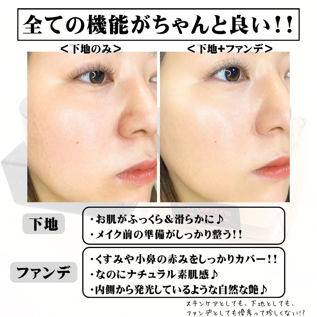 スキンケア成分たっぷりなベースメイクって、カバー力が足りないとか、ヨレやすいみたいなイメージがあったんだけど、これはオールマイティな優秀アイテムだった🤩❤️ しっかり保湿して滑らかに仕上げてくれる下地のお陰で、ファンデがピタっと密着😍✨ カバー力すごいのに素肌感が残ってて感動した〜😮💨❤️ shu uemuraのベースメイクは元々愛用していたけど、更なる進化を感じました🤩