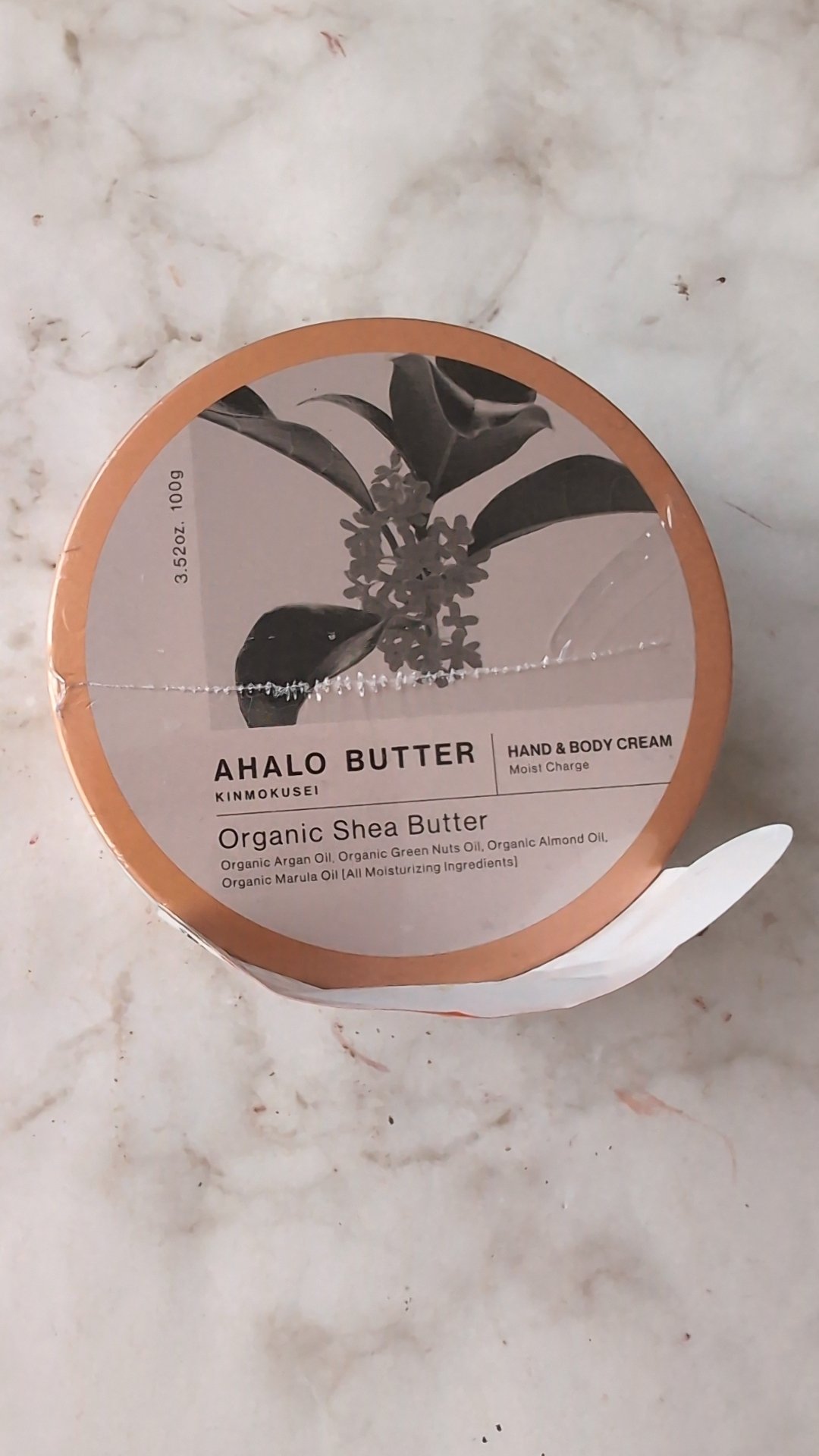 AHALOBUTTER ハンド&ボディモイストクリームキンモクセイの香り100gを年末あたりに購入してやっと開封して使用しましたので投稿します。100g1430円通常価格ですが画像の通り286円+金木犀の香りが大好きだったため購入しました。使い心地はベタベタしないのでクリームが緩すぎてななめにしたら溢れそうな感じでした。数時間しても潤っているのでクリームとしてはよいと思います。基本的お風呂上がりにぬるのでベタベタしすぎるとすぐ服が着れないと嫌なのでこちらはそれはなかったです。もう1本買っておけば良かったとちょっと後悔の品でした(^◇^;)未開封なら数年もちますもんね...。