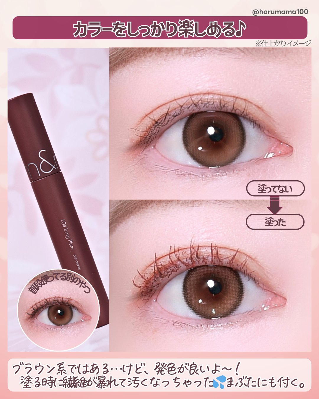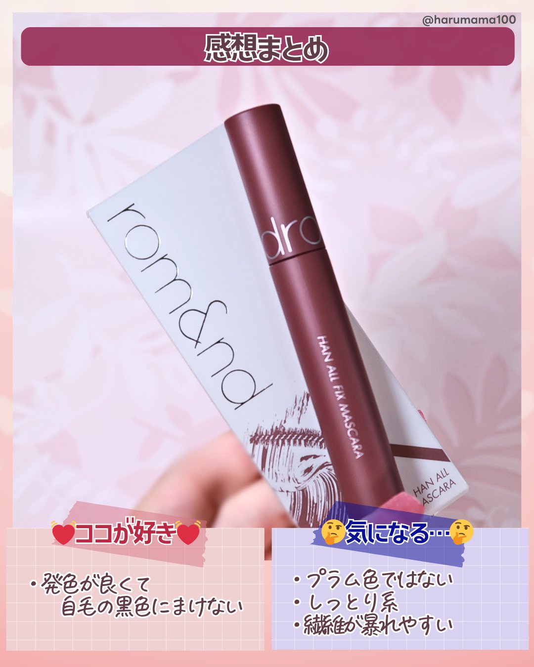 rom&ndのハンオールフィックスマスカラのL04ずっと気になってたマスカラ購入しました!✼••┈┈••✼••┈┈••✼••┈┈••✼••┈┈••✼【使った商品】rom&ndハンオールフィックスマスカラL04LONGPLUM(日本限定)【商品の特徴】プラム+ブラウンの絶妙なカラーで抜け感を出してくれる!【使用感】液は割と重ためな気がしました。まつ毛にしっかり抜け感でてとても可愛いです🫶乾いたらちょっとパキパキになるけどカールキープされるし根元の方に液をしっかり付けておくとつけまつげした時のように二重がキープされやすく感じました。【良いところ】発色がとても良くてまつ毛にしっかりついくれる!横から見た時の色が凄く綺麗です!まつ毛のカールもしっかりキープしてくれてると感じました【イマイチなところ】すごくダマになりやすいです💦私の使い方が下手なのかもしれませんがまつ毛コーム使ったりしても乾いたあととかだと凄く汚くなってしまう印象でした……個人的に乾く前に大体コームでとかしてしまうか乾いてしまったらスクリューブラシでとかすかとをおすすめします!結構ダマ取れる!【どんな人におすすめ?】ピンクメイクをしたり、ヘアカラーがピンク、レッド系の人には統一感がでていいと思います!抜け感がでるので黒髪とかでも可愛いのでは無いかと思います!ただダマになりやすいのが難点……【使い方】上まつ毛に使う時は左右に2から3回くらい根元から揺らし、そのまま上にスっと上げるとまつ毛にしっかり着いて伸びてくれます!ただ勿体ないかもしれませんがしっかりしごいてからつけた方がつけすぎ防止にもなり綺麗に仕上げることが出来ると思います!#rom&nd#韓国コスメ#マスカラ#商品レビュー