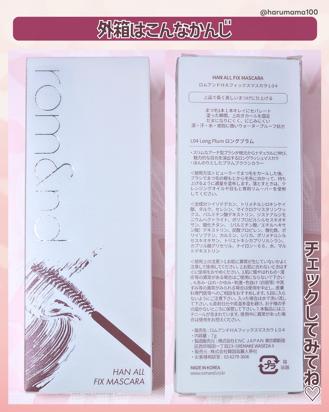 ♡rom&ndハンオールフィックスマスカラL04LongPlum販売価格1430円7g03ヘーゼル、02アッシュに続き04プラムブラウンも追加Qoo10メガ割りで購入しました派手すぎず柔らかい雰囲気になりオシャレ感が増すようで気に入っています...