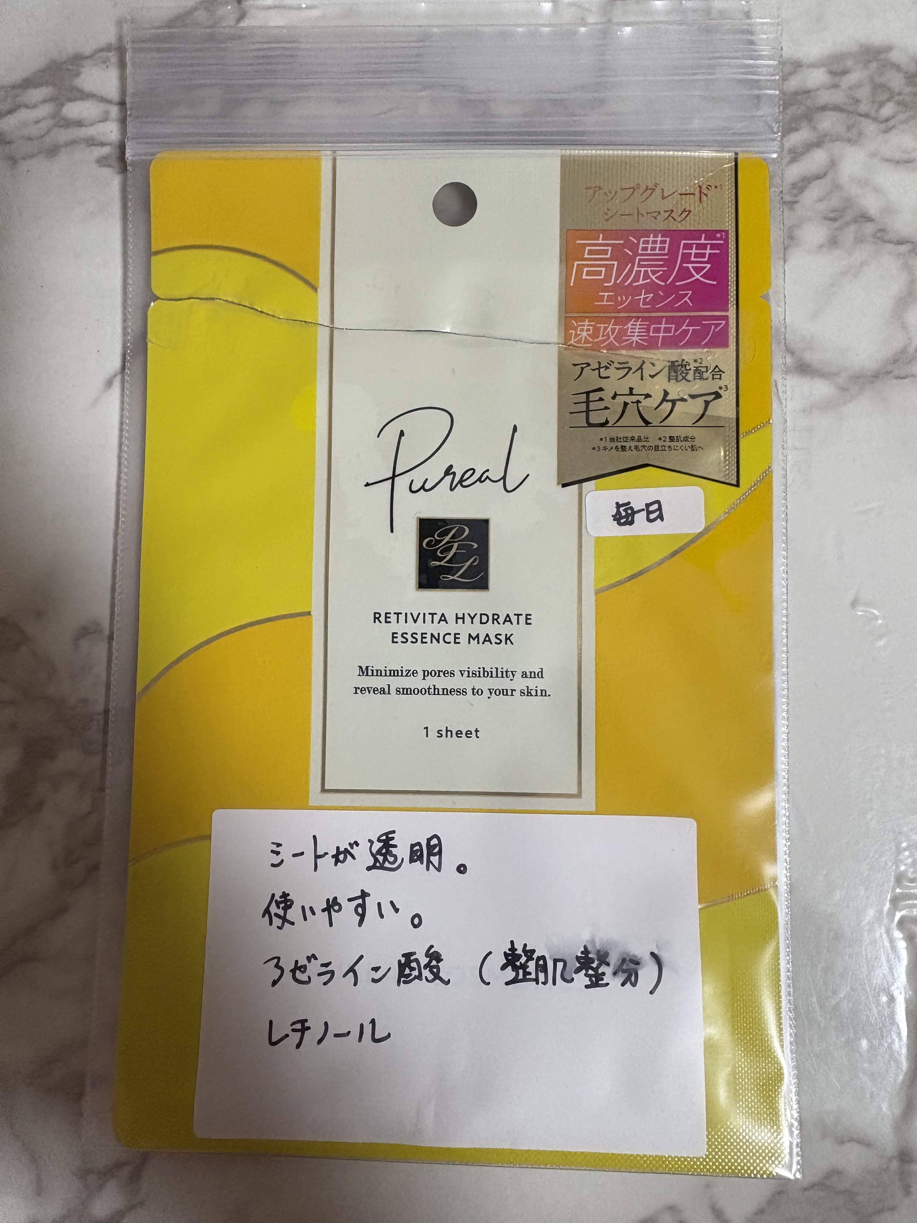ピュレアのレチビタエッセンスマスク7枚入り¥660円です。シートが透明です。使いやすい厚さです。アゼライン酸などが入っています。又、レチノールが入っているので朝使わず夜にしたほうがいいと思います。
