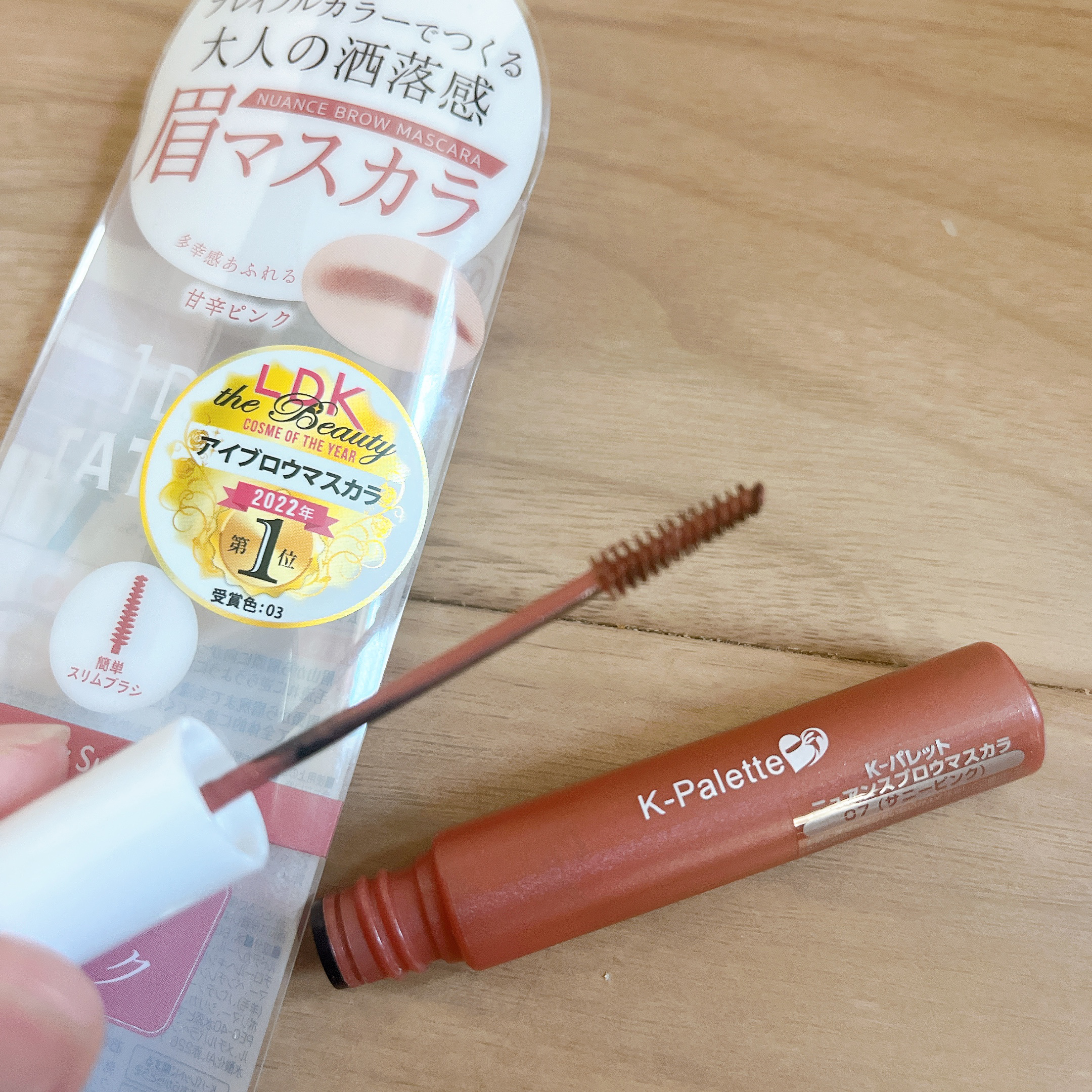 K-パレット ニュアンスブロウマスカラ! くすみっぽいピンクの眉マスカラで垢抜け眉が作れます😼✨️ わたしはキャンメイクのミックスアイブロウカラー(C02 ジェラシーパープル)のパープルのパウダーをのせてから、このニュアンスブロウマスカラを塗っています😌 めっちゃかわいいんです、おすすめ🥹🥹🥹