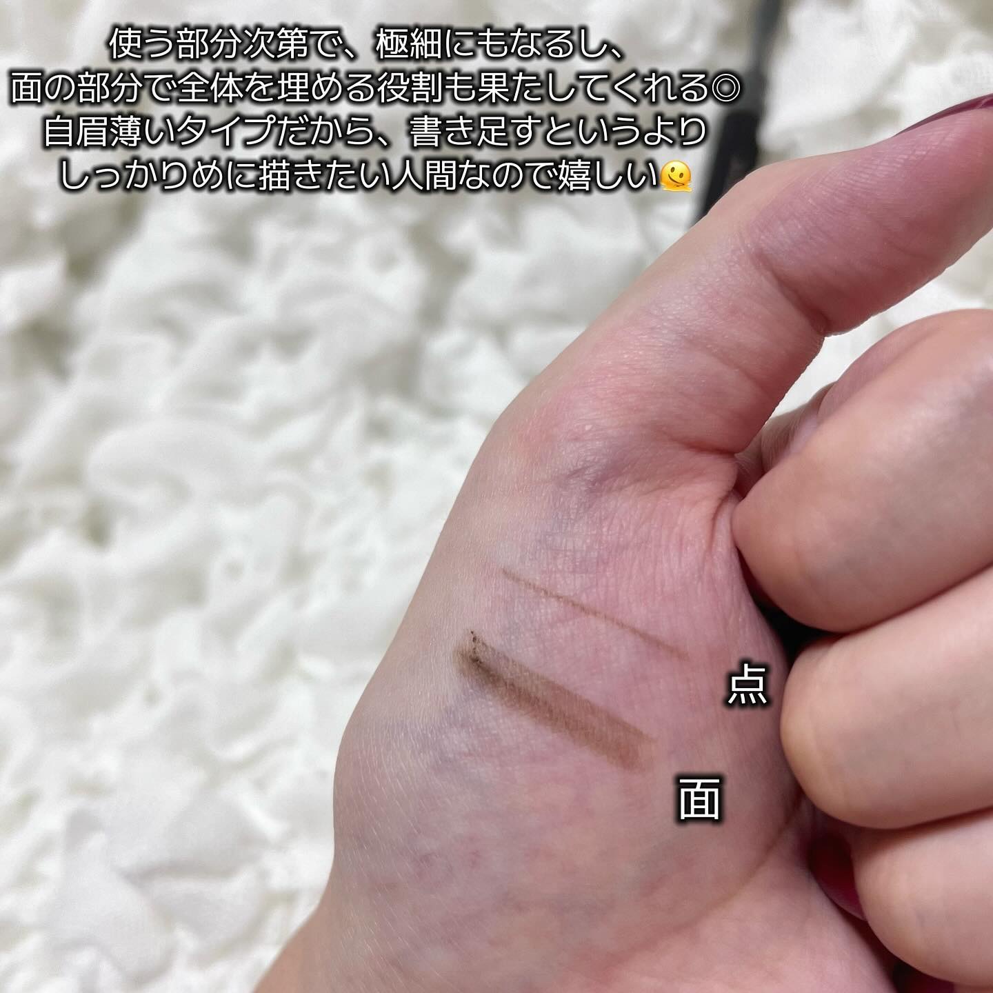 点・線・面の3種類の使い方ができる 便利な3角芯が特徴のアイブロウペンシルですっ!! 角を使えば細い線 辺の部分で少し太い線 面を使って広い面を描くことができます◎ それぞれ、使い分けすることができるので 眉毛も描きやすいっ♡ᵎᵎᵎ 繰り出し式のペンシルタイプで使い勝手がよきっ👌🏻 カラーは、くっきりしずきない自然な色味なので 髪の毛にも合わせやすかったです! 幅の広い細かな毛先のブラシがついていて 眉毛を均等にぼかすことができるので 簡単に自然な眉毛を描くことができて すごく便利でしたっ🙌🏻✨ 不器用なわたしは、眉毛を描くことがとても 苦手だったんですが これを使ったら本当に綺麗に描けました🥹❣️ 気になる方は、ぜひチェックしてみて くださいね✩°̥࿐