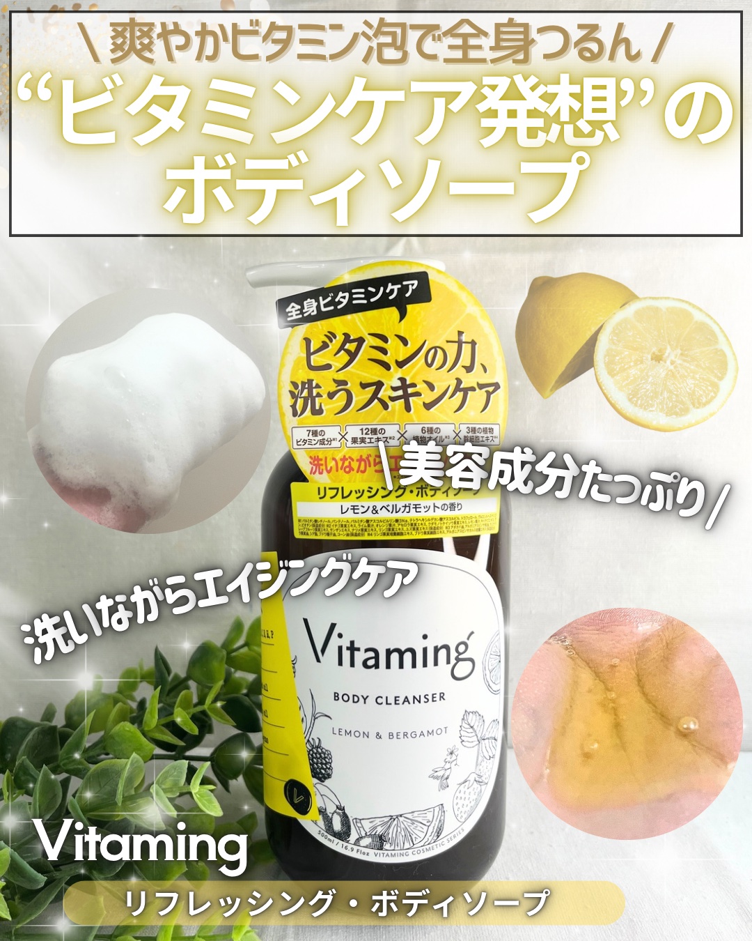 🍋秋冬こそ、ビタミンで洗う。寒さとともに、肌の乾燥やくすみが気になり始める季節!つい“保湿ケア”ばかりに意識が向きがちだけど、実は「洗うケア」こそが秋冬の美肌の近道?!「VITAMINGリフレッシングボディソープ」は、肌にやさしいビタミン由来...