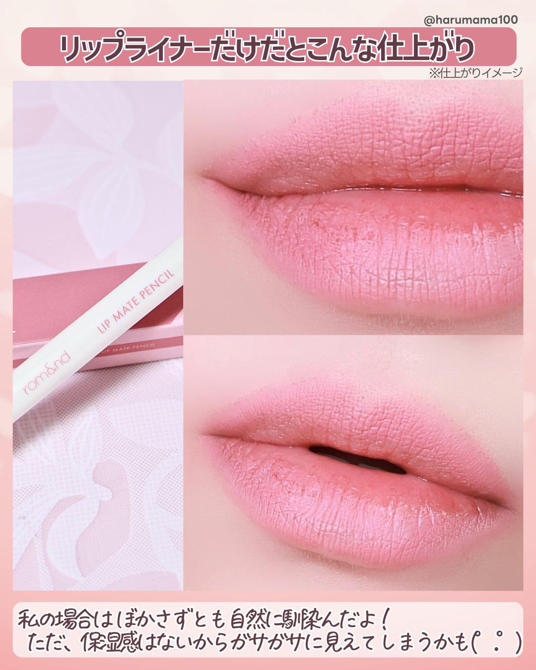 【ミルキーなくすみフィグ♡ロムアンドのリップライナー!】───────────────rom&ndリップメイトペンシル04フィグブリーズFIGBREEZE参考価格1,210円(税込)───────────────ティントで大人気「ロムアンド」はリップライナーもオススメ〜♡するする描きやすい柔らか芯とブラシつきでぼかしもお任せなの♪今回使った「フィグブリーズ」のカラーは白みしっかりめのくすみピンク色。ティントの色をイメージしてたから、かなり白かった…んだけど、なじみのいい可愛いカラーだったよー👏自然に輪郭を拡張できるし、唇自体をグラデっぽく見せられるからボリューミーな印象に仕上がった🥹陣中短縮とかの影色にも使えそうなカラーだと思う💕───────────────#コスメ購入品#내돈내산#rom&nd#ロムアンド#韓国コスメ#リップメイク#リップ#リップライナー#lipliner#メガ割#Qoo10#Qoo10メガ割
