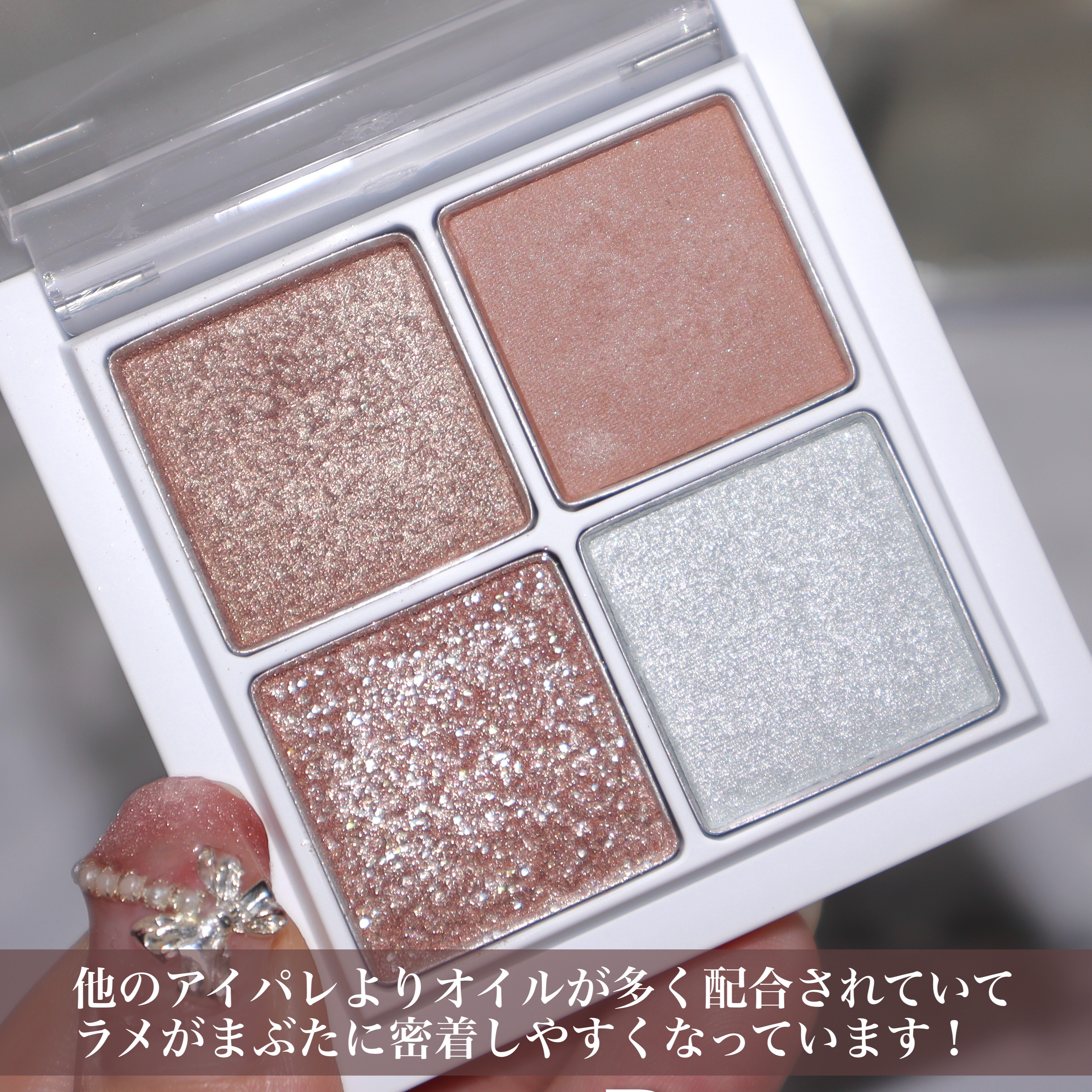 【使い心地】・粉質はしっとりで密着・ラメ飛びしない・微細なパールで濡れつや感を演出できる∟その秘密は、ラメの密着力をあげるために、オイルを多く配合しているみたい。なるほど!(ベタベタやオイル感は感じません) 【カラー】・絶妙な色合いでイエベ・ブルべ問わず使える・発色は抑えめなので、塗り方で調整可能◎ ①ゴールドしっとりパール∟キラキラしすぎず上品に発色②絶妙なブラウンベージュのマット∟特にお気に入り!メインで使ったり、上から①③を重ねて華やかにしたり、幅狭く塗って影っぽく使ったり…と色々な使い方をしています③微細なシルバー&ゴールドラメ∟塗ると思ったよりシルバー強め。イエベの私はつけすぎると浮いてしまったので、上まぶたの黒目の上につけるくらいがいい感じ!④シルバーホワイトのハイライトカラー∟このパレットでハイライトまで完成しちゃう。他のカラーと混ぜて涙袋につかってもよき
