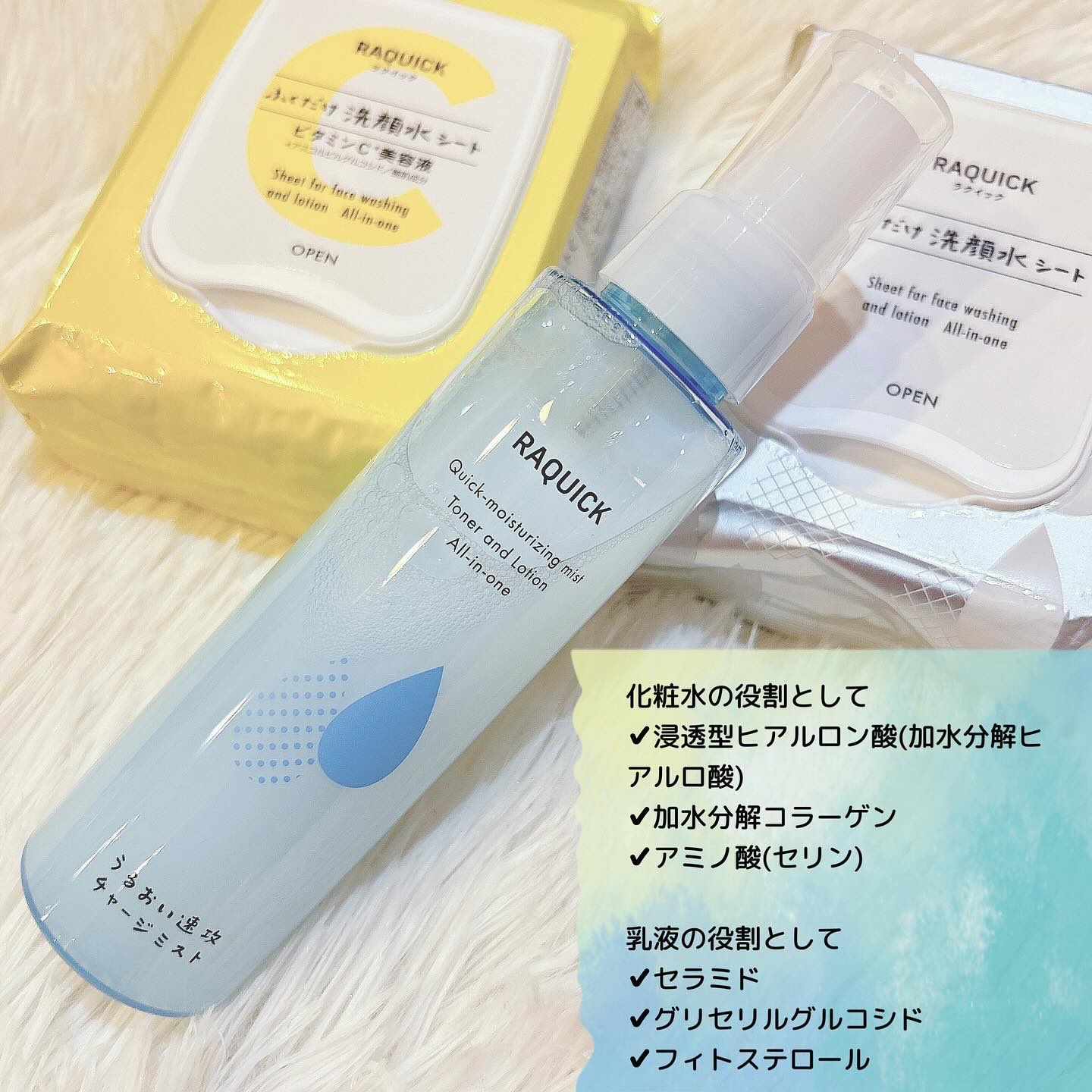 ラクイックいつでも手軽に使える洗い流し不要のシートのご紹介です♪┈┈┈┈┈┈┈┈┈┈┈┈┈┈┈┈●ふくだけ洗顔水シート●ふくだけ洗顔水シート・ビタミンC美容液●1秒保湿うるおい速攻チャージミスト┈┈┈┈┈┈┈┈┈┈┈┈┈┈┈┈私と同じズボラ仲間さんいますか〜?笑このシートは、顔を拭くだけで洗顔が完了するシートなんです。◤ふくだけ洗顔水シート◢は、シンプルに洗顔として使えるのでスキンケアはご自身のお気に入りを使いたいのよ〜という方にオススメ。ふくだけ洗顔で余分な皮脂・汚れを浮かせてやさしくふき取ることができます。✔ハトムギ種子エキス ✔アロエエキス ✔オリーブ葉エキスを配合しているので、ただタオルで顔をふくだけとは違い適度に保湿もしてくれました。◤ふくだけ洗顔水シート・ビタミンC美容液◢は3つの美容保湿成分配合。✔Wヒアルロン酸※1✔加水分解コラーゲン✔アミノ酸※2この3つの美容成分で、洗顔だけでなくスキンケアまでこれひとつで完結できちゃうアイテムとなっています。ズボラさんのお助けアイテムとしてだけでなく、これひとつで完結するとなれば、キャンプに行った時やスポーツをした時、学生さんの部活後や災害時にも便利に使えると思っています。シュッと取り出せるので使いやすく、コンパクトなので携帯もしやすいです。バッグに入れて持ち運びにも便利です✨シートですが、柔らかく厚手のシートを採用。顔を拭くのにも気持ちよく使用できます。ズボラさんにはもちろん、洗顔ができない状況下にも便利に使える商品だと感じました✨◤1秒保湿うるおい速攻チャージミスト◢化粧水+乳液がこれ1つで完了する、うるおい速攻チャージミストです。化粧水+乳液が1アイテムで完了👍🏻̖́-︎シュッと吹きつけるだけで完了する時短アイテムです〜しかも手も汚れないので寝ぼけていても大丈夫(笑で、シュッとするとひんやり冷たさでいい感じに目が覚めます🤭笑細かいミストが顔全体に広がり肌への馴染みもヨキ♡化粧水の役割として✔浸透型ヒアルロン酸(加水分解ヒアルロ酸) ✔加水分解コラーゲン ✔アミノ酸(セリン)乳液の役割として✔セラミド ✔グリセリルグルコシド ✔フィトステロールこれらを配合しています。\1秒保湿うるおい速攻チャージミスト/片手で手にしてシューっとするだけのミストもぜひチェックしてみてください😊こちらを使う時には洗顔してくださいね〜笑笑※1ヒアルロン酸Na、加水分解ヒアルロン酸(浸透型)※2セリン#PR#ラクイック#洗顔水シート#時短スキンケア#洗顔#化粧水#ふくだけ洗顔水シート#1秒保湿うるおい速攻チャージミスト#ズボラアイテム#時短アイテム