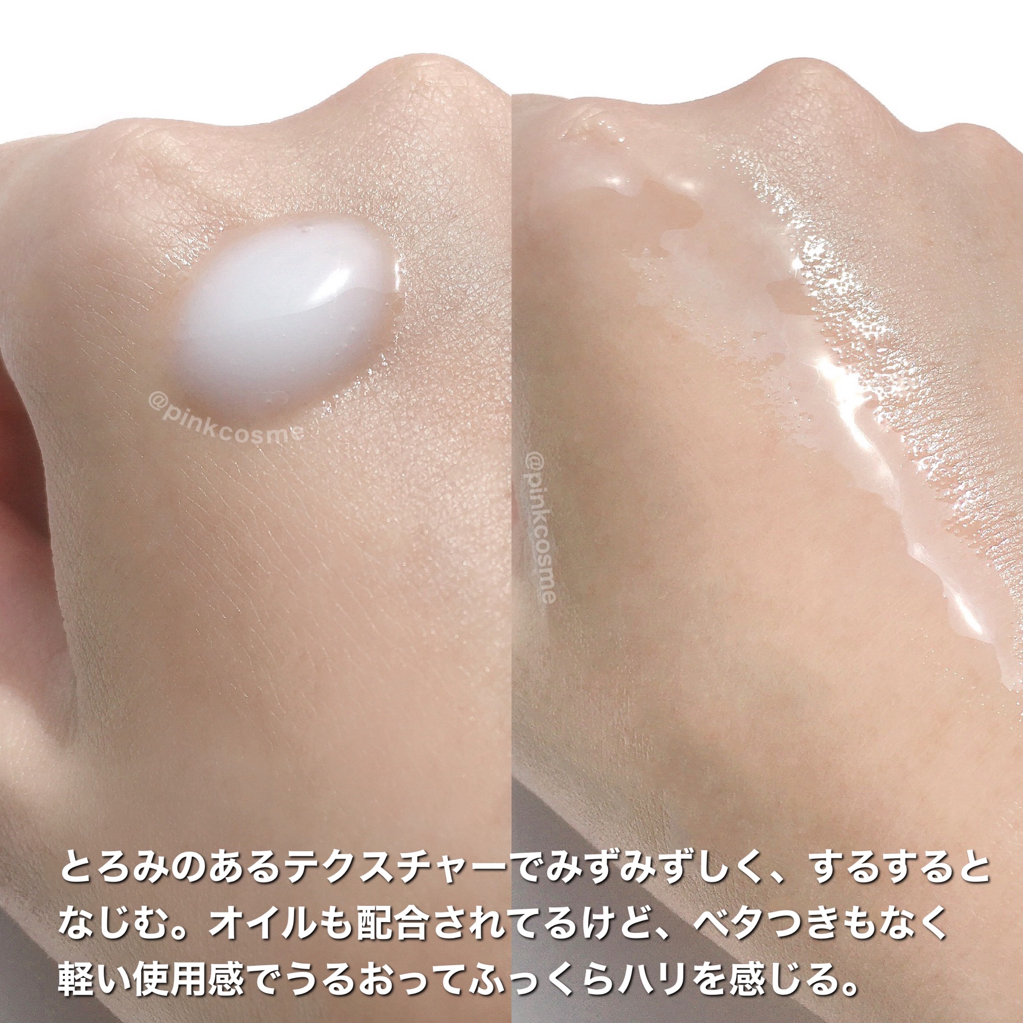 みずみずしくなめらかなテクスチャーで、肌馴染みが抜群! スッと、じゅわっと、肌に心地よく馴染んでいく感覚がたまらない…! 塗ってすぐ、肌の密度がぎゅっと高まるようなハリ感あり。