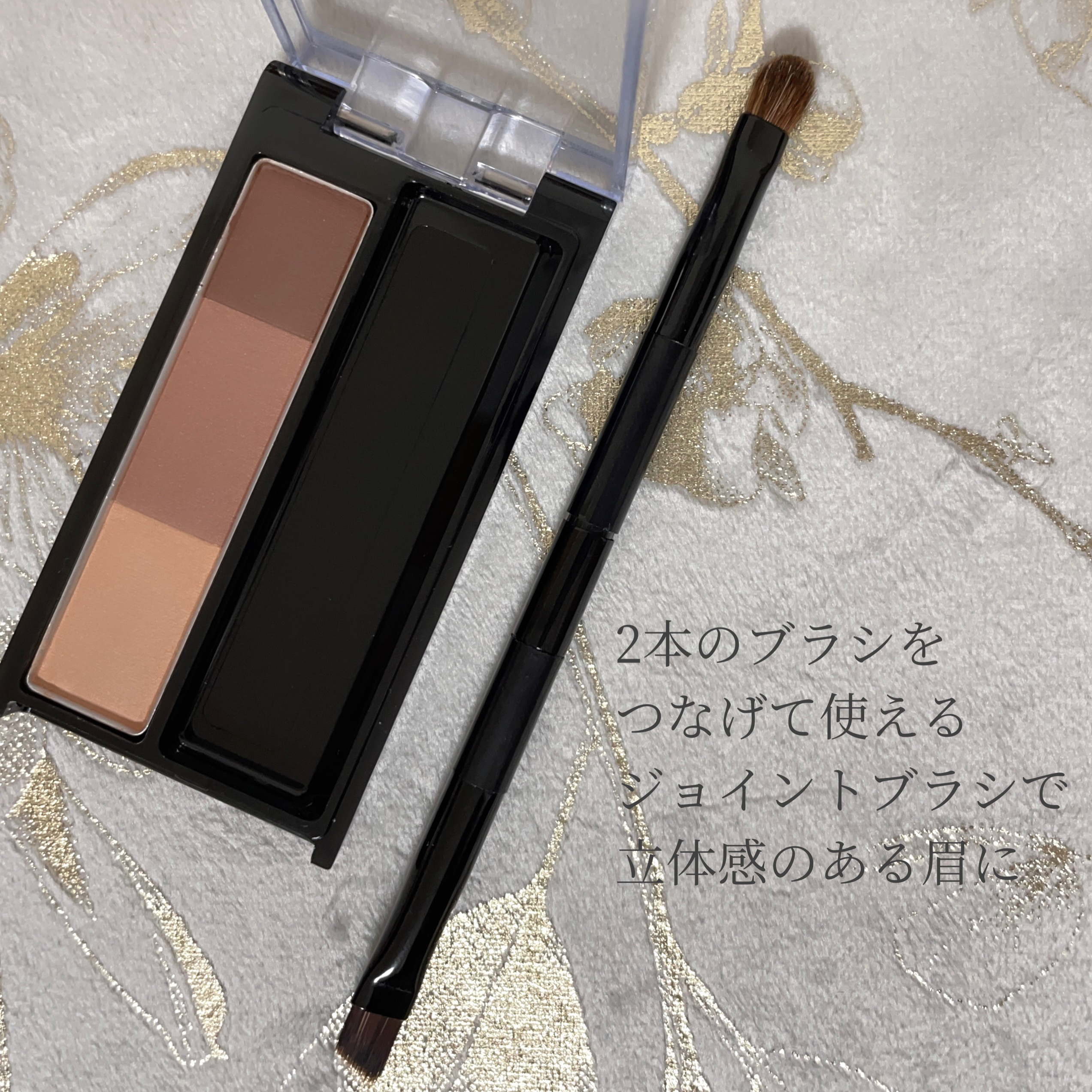 3色入りでミックスして自分好みのカラーに調整しやすい◎ ホホバオイル配合で粉飛びしにくい処方 02ピンクブラウンはほんのりピンクであったかみのあるふんわり感ある眉に🥰 シャープブラシとラウンドブラシが別々になっていて、つなげることができるジョイントブラシ 長さがあるので安定感あって描きやすい✨ 分けてコンパクトに収納できるよ!