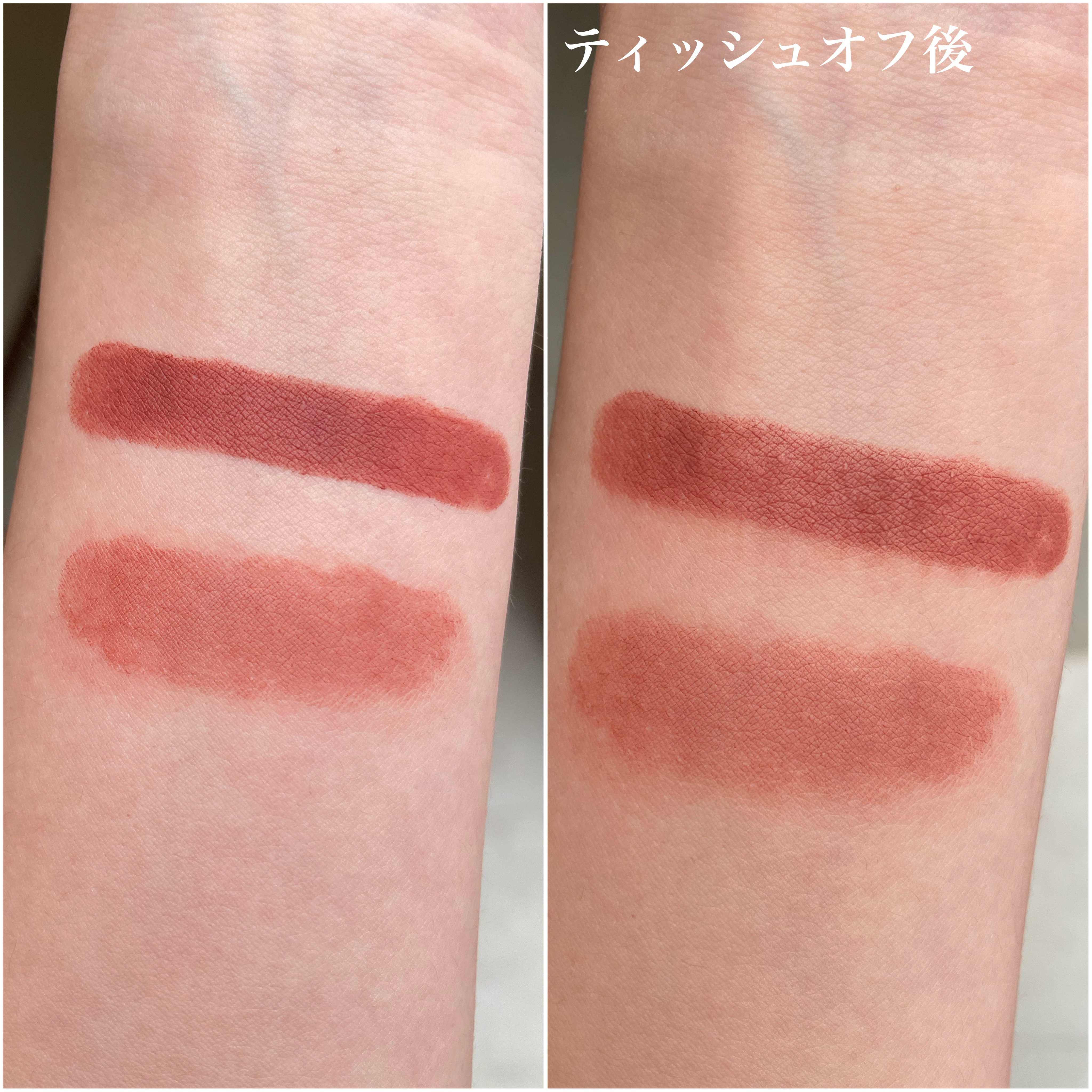 このリップが発売して話題になったカラー101【NO ANGEL】とパッと見似てますが、こちらは101に比べてオレンジが強め。 ここまで深い色のリップだと紫が強くて「何か違うな💦」となってしまう事が多いのですが…このリップは深いけど紫みが無くて正真正銘のディープブラウンリップ🤎 色の表記はウォームピンクブラウンとなっていますがオレンジ強めに見える⁈ でも名前にピンクブラウンとあるように121に比べるとブラウンみが確かにある💡