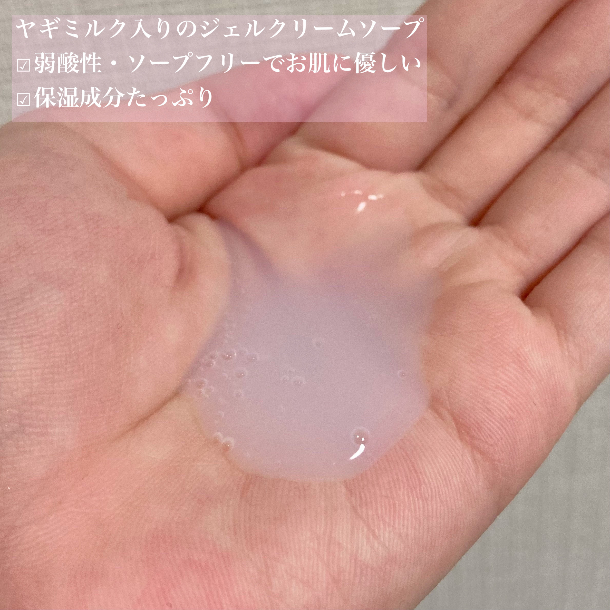 お花の香りと植物性成分を配合したスキンケア仕様のお肌にやさしいボディシャンプー ゴートミルク(ヤギ乳:保湿成分)、弱酸性でソープフリーで敏感肌にもおすすめなボディソープ。 濃厚で甘いダマスクローズの香りで、高級感のあるボトルが特長。 手に出した瞬間ネーミング通り、つやっと輝きがありネットで泡にすると優しいなめらかな泡でした✨ 汚れや古い角質を洗い流してくれるそうなので輝く美肌に期待したいです💕 香りもボトルもとっても大人上品なのでお気に入りです。