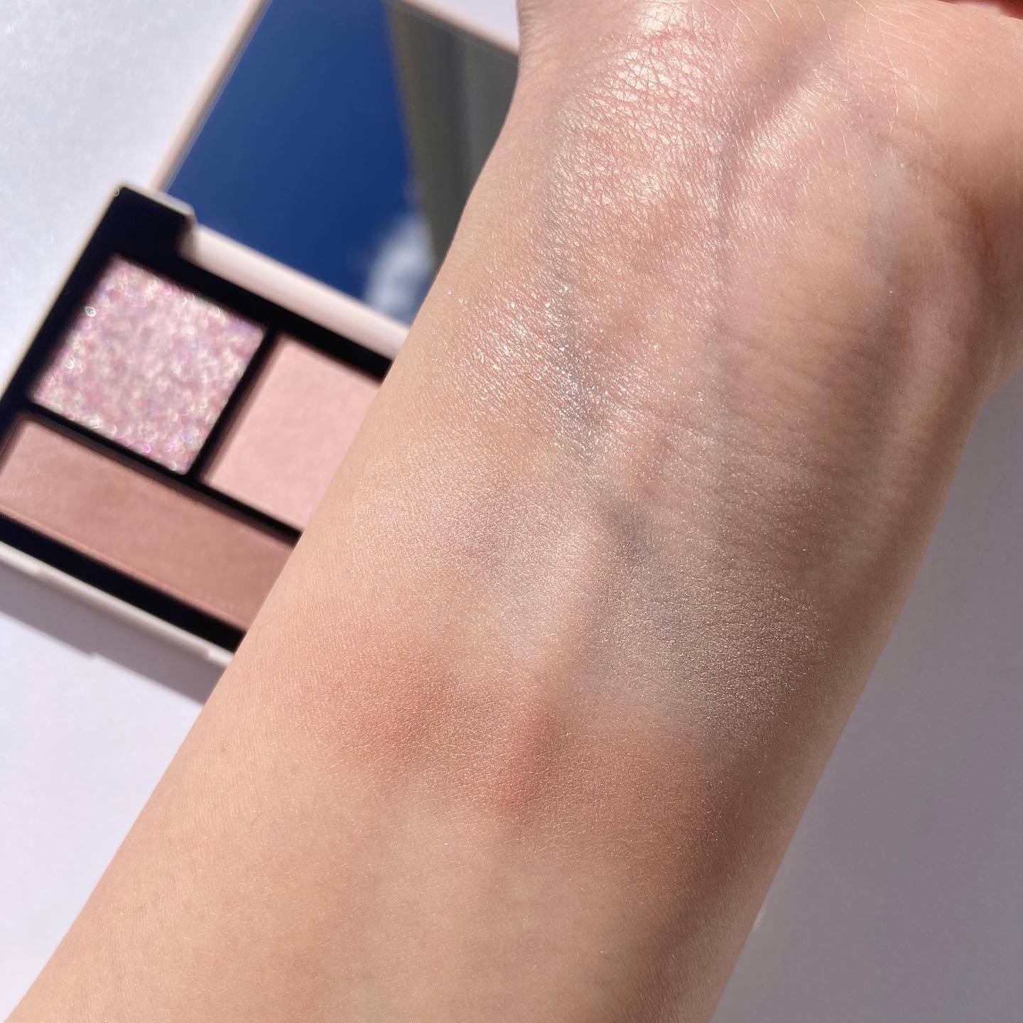 テイラード カラー アイズは今年発売されたばかりの新作アイパレットで、定番色買ってみようかなーと思っているタイミングで発売されたのでまずは(?)限定を買ってみました♡ 3色パレットになっていて、それぞれシアーな発色。 左上:ブルーやピンク、シルバーのきらきら多色ラメ 右上:ピンクの偏光パール 下:ほんのりパール感のあるココアブラウン カメラだと映しにくいんだけど、繊細なラメ・パール感を楽しむことのできるアイシャドウです♡ 優しい発色のアイシャドウがお好みの方におすすめです♡