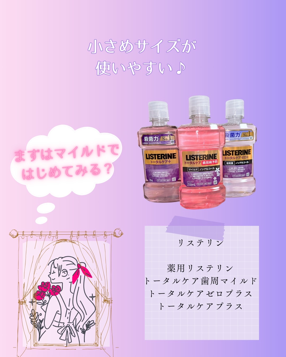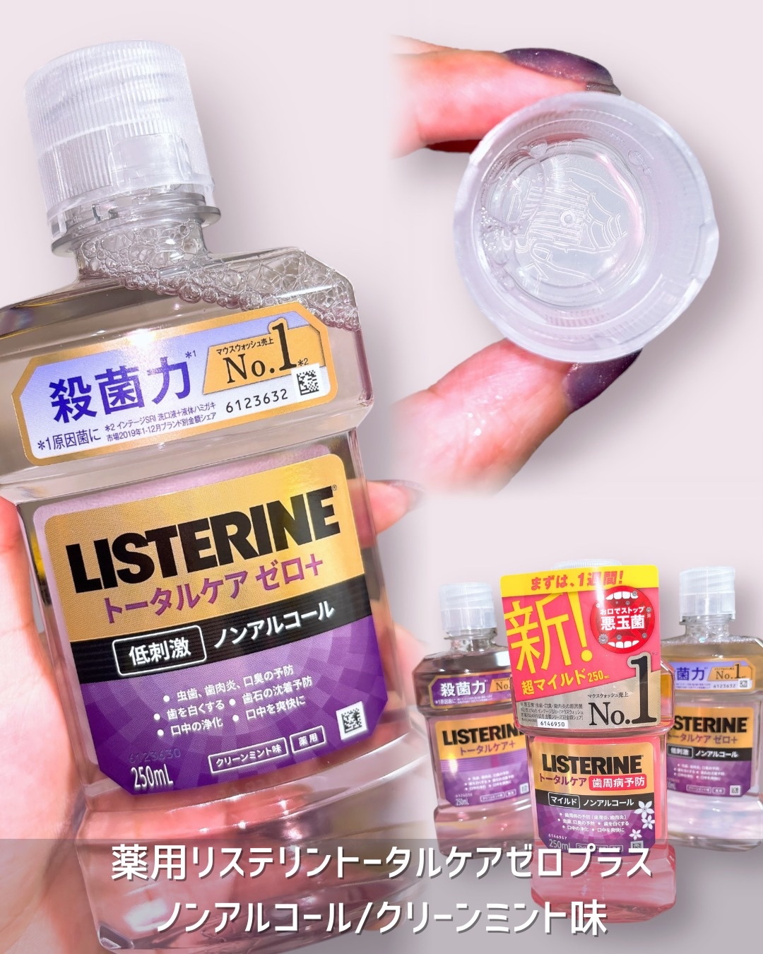 オーラルケア初心者集合/オーラルケア気になるけど独特な味や刺激が強いのは苦手…って人集合!歯磨きで落とせる汚れとそうじゃない汚れがあるから歯磨きのほかにフロスを使ったりマウスウォッシュをしたりすることで健康な歯を長く維持できるっていうのを知って、マウスウォッシュせねばと思ってたけど味が強いのとか強刺激は苦手で…リステリンずっと気になってたんだけどずっと試せてなかったの。今回使ってみたらとっても良かったから新しい習慣になったよ♪使い方はキャップ1.5杯分を30秒間口に含んでから歯磨きするだけ♪毎回気を付けてるんだけど、歯医者さんに行くたびにオーバーブラッシングを指摘される私みたいな人も、研磨剤が入ってない液体歯磨きだから安心💕刺激少な目を意識したアルコールなしのマイルドバージョンがあるって知ってた?バリエーション豊富でそれぞれの特徴がしっかりあるから、自分にぴったりなアイテムが見つかるはず🦷✨🎀薬用リステリントータルケア歯周マイルド🎀新作の歯周ケアマイルドは歯周ケアが気になるけど、強い刺激が苦手な人にぴったり!ほんのりフローラルな香りが広がって、リフレッシュできるよ💖リステリン史上最小限の刺激で、歯肉炎や口臭、着色汚れを予防してくれる✨毎日のケアが苦じゃなくなる、やさしい使い心地が特徴!ノンアルコールで刺激とかほぼなかった!💜薬用リステリントータルケアゼロプラスベーシックなトータルケアプラスのノンアルコールタイプ!「アルコールが苦手」「低刺激がいい」って人にオススメ!ノンアルコール処方だから、刺激が少なくて使いやすい💫クリーンミント味でお口さっぱり🍃家族みんなで使えるから、毎日のケアが楽しみになるよ💖💪薬用リステリントータルケアプラスしっかり予防したいならこれ!アルコール入りのトータルケアプラス!毎日のケアを頼もしくしてくれるよ✨クリアミント味で、刺激は多少ピリっとするくらいで私は全然気にならなかった♪結構痛みとかいろんな感覚には過敏なんだけど、そんな私でも問題なく使えた💕これからはマウスウォッシュも習慣にしていこ🥰🎀詳細🎀リステリントータルケア歯周マイルドトータルケアゼロプラストータルケアプラス