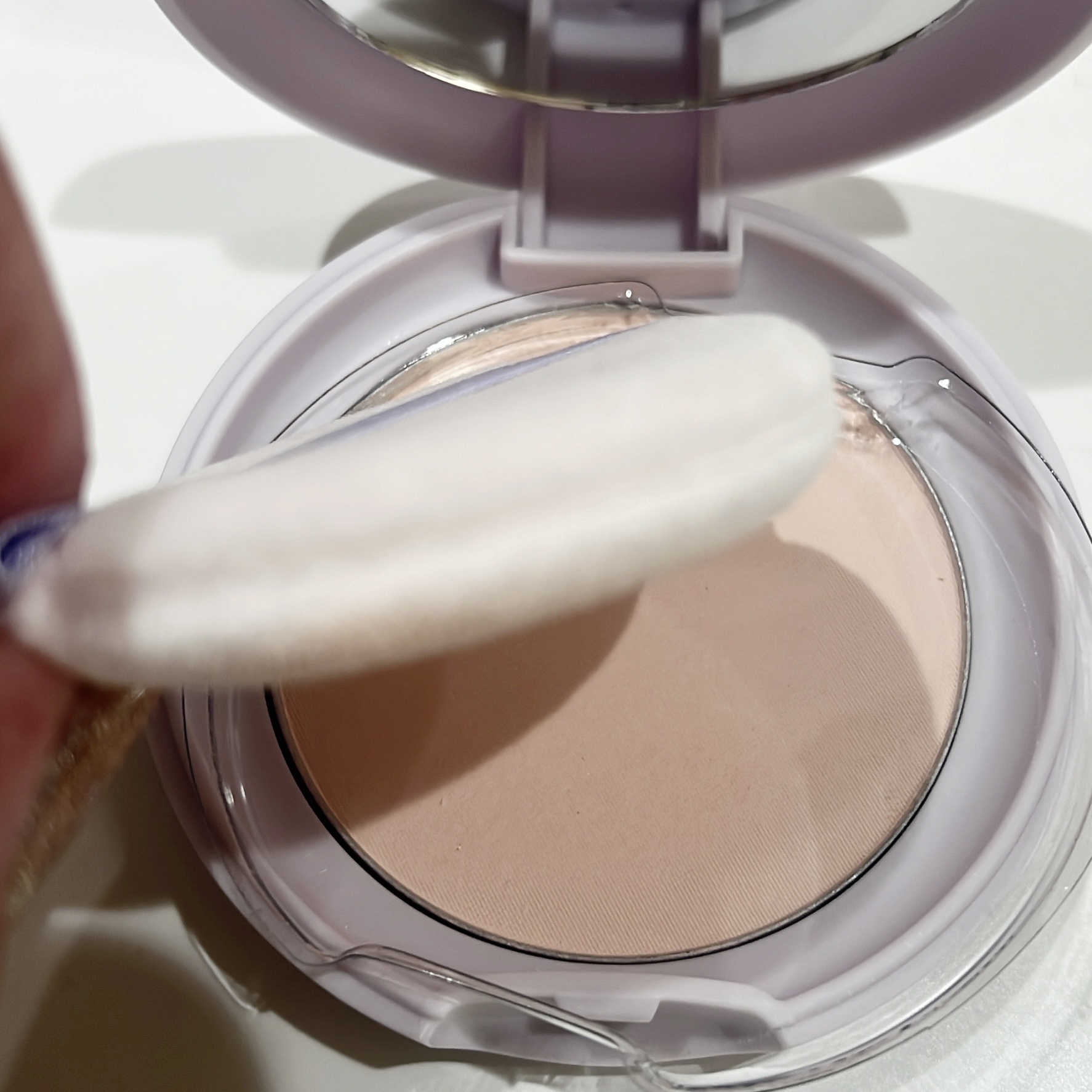 厚めのもちもちパフはしずく型になっているので小鼻や目の周りの細かい部分にもムラなく塗りやすく、薄づきなのにしっかりとカバー力がありました。 保湿成分配合で明るいツヤ肌を演出してくれ、仕上がりはサラリとしたセミマット肌に!! ピタッと密着してマスクに色移りしにくいのも嬉しいです⭐ 粒子が細かく、ふんわりとした軽いつけ心地でサラサラとした仕上がりなのに保湿成分配合なので、乾燥は気になりませんでした。淡いピンク色のパウダーで血色感を与えてくれ、明るいお肌にもみえましたよ!