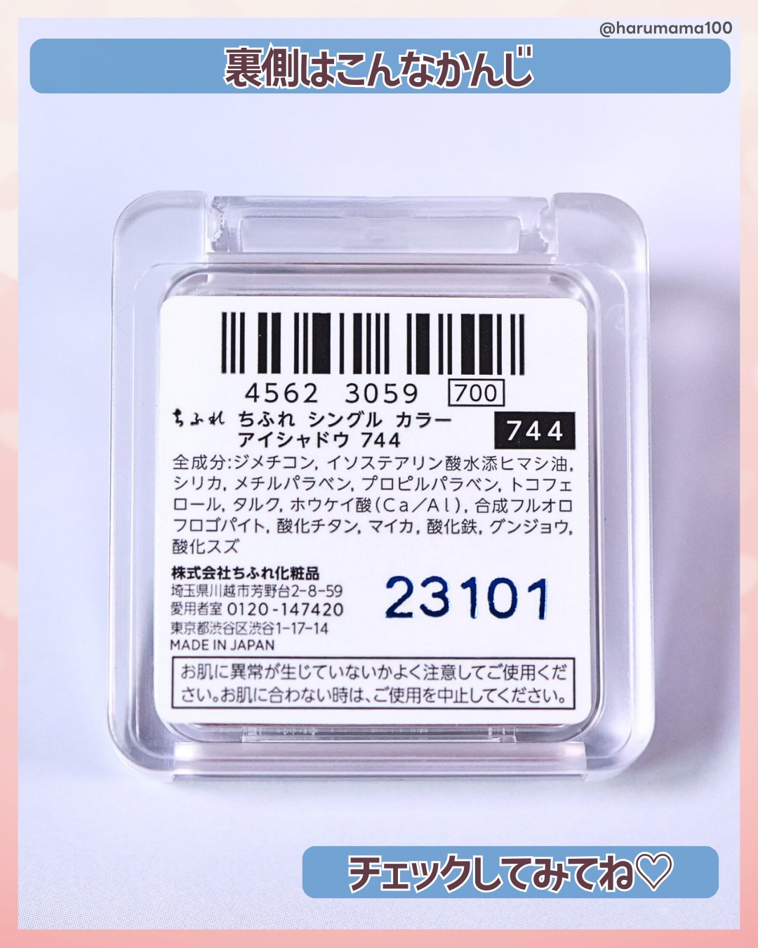 ちふれシングルカラーアイシャドウ744ブラウン系すごいちっちゃいのに770円かあ4色パレットにしたら3000円やんと思いつつ、いつも見ていたのですが友達が本当に綺麗なアイシャドウをしていてデパコスかと思ったらまさかのちふれと聞いてアイシャドウベースはデパコスだそうですがこのまま単体でもラメがきれいでなかなかいいよと教えてくれたので試しに買ってみました。赤が混じるブラウンで、ベースカラーも使いやすく、濃くつきすぎないのでシングルカラーでグラデーションが作りやすいです。ラメもめちゃくちゃきれい。ただ、朝7時頃メイクして用事を済ませて11時頃みたら薄くなってたので、お安くてもいいからアイシャドウベースがあった方が発色ももちもよくなると思います。赤っぽい色も可愛かったです。