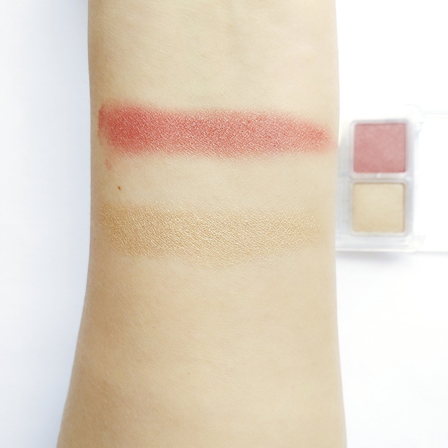キラキラのラメが似合わないので、このベージュのパール感がめちゃくちゃちょうど良いです。 赤も指で適当にグラデーションにするといい感じにピンク系メイクになりました。 色持ちは全然しないので、使う時はアイシャドウベース必須だと思います。