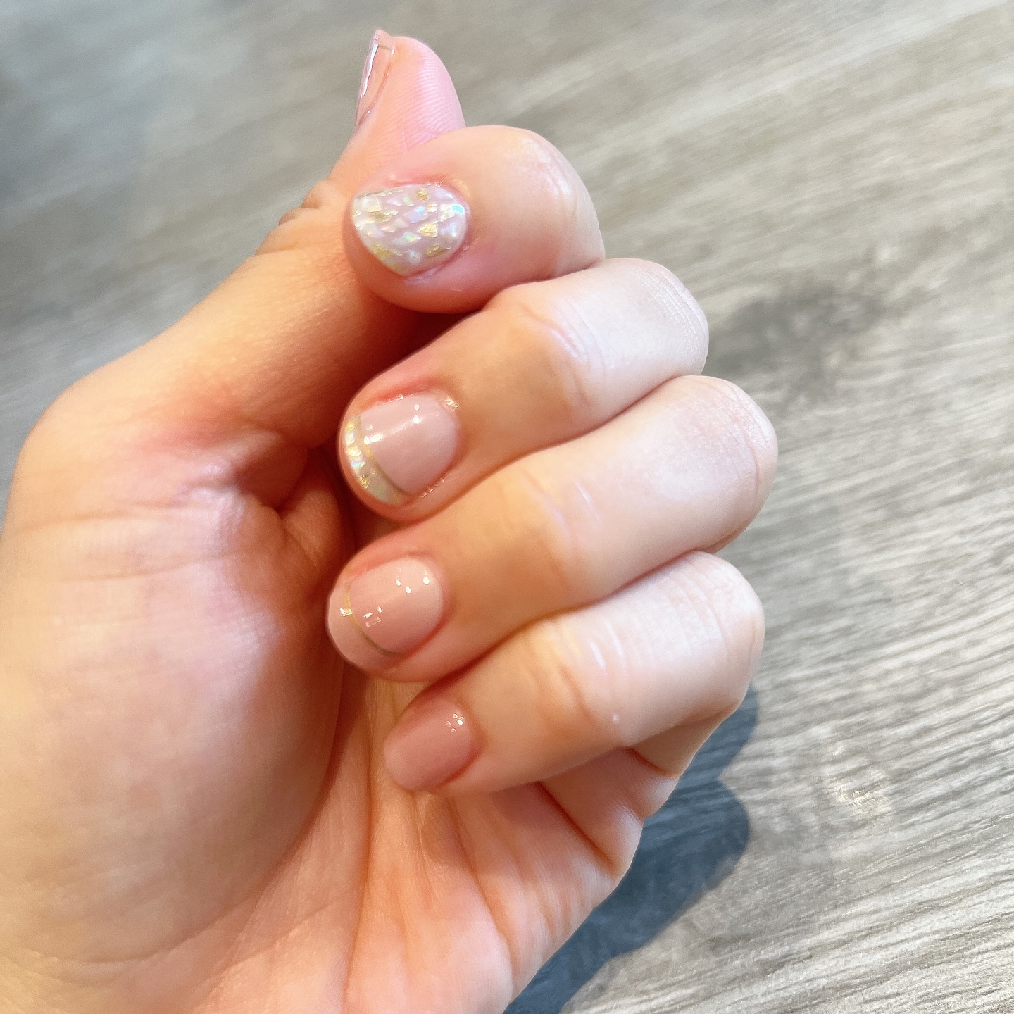 oholaで夏の上品ネイル୨୧今回はハンドは上品なオフィスデザイン。ND-053-JNCreamShell落ち着いたベージュピンクのグラデーションにゴールドのライン。さらにホワイトカラーにキラッキラのシェルやゴールドの入ったデザインがポイント...
