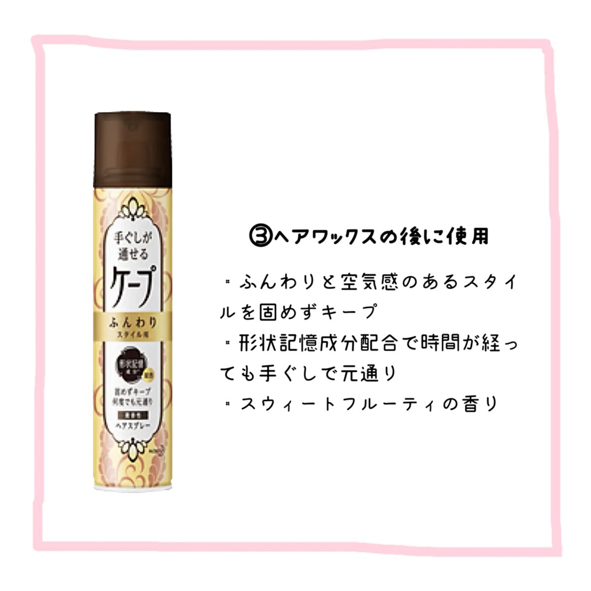 手ぐしが通せるケープだと、スタイリングをキープしつつ、髪の毛を手ぐしでとかすことができます! 髪の毛のスタイリングをキープしたいけど、カチカチな仕上がりはあんまり、というときに使ってます!