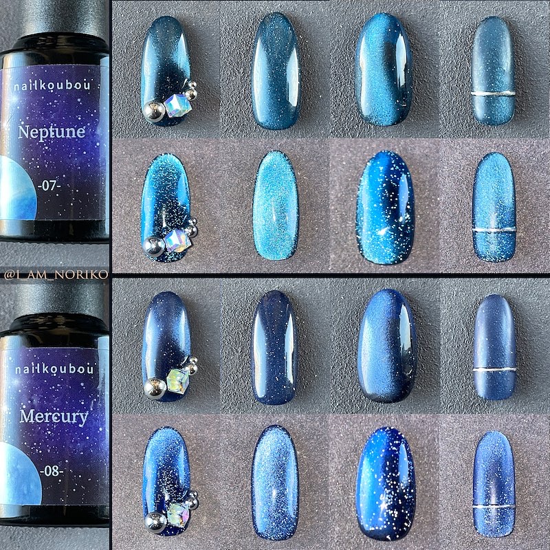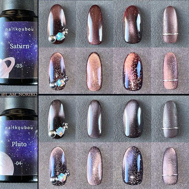 ネイル工房新発売フラッシュマグネット✨銀河シリーズ#ネイル工房公認クリエイターの#Nollico(ノリコ)@i_am_norikoです銀河シリーズ全10色のカラーチャートを作成しましたご参考にしてください✨煌めく星空宇宙の輝きでテンション上がります♪*..………【色見本】①マグネット斜め出し+ビジュー②マグネット全面出し③黒に白フレンチをベースカラーにマグネット半分出し④マグネット全面出しマット仕上げ+ミラーライン⑤それぞれをフラッシュ(強光)*..………▪️今回の新色フラッシュマグネットは光の加減によっては3と6が少々似たカラーです。個人的な主観ですが3と6を比べると、6の方がややオレンジがかったブラウンに見えます。▪️磁石を当てなくても、フラッシュしなくても十分キラキラ美しいので、マグネット出しand出さないパターン両方楽しんでいただきたいなと思いました*..………ネイル工房(@nailkoubou)から2月4日に銀河シリーズが発売しました。URLhttps://a.r10.to/hNxC6q【使用アイテム】 すべて#ネイル工房・★銀河シリーズ 全10色・★ノーワイプトップジェル6・ビジュージェル15・★ミラージェル・ノーミラーマットトップジェル・オムニジェルOMA-02,04・★4Dマグネット・マグネットネイル専用磁石(黒軸)・★痛ライナー白・★ソリッドミラーパウダー19・zecca筆 ★オーバル★アンギュラー ライナー・★nanaストーンキューブ型ABクリスタル・★軽量メタルボールシルバーボール5mm・★高品質ブリオンシルバー3mm2mm*今回使用した★商品はネイル工房さまより提供していただいた商品です*製品情報はネイル工房の商品ページでご確認ください.*..………………………………..*.NailAlchemistNOLLICO@i_am_noriko ......#PR#マグネットネイル#フラッシュマグネットネイル#宇宙ネイル#ギャラクシーネイル#キラキラネイル#カラージェル#4Dマグネット#ビジューネイル#ニュアンスネイル#フラッシュネイル#ジェルネイル#セルフネイル#セルフジェルネイル