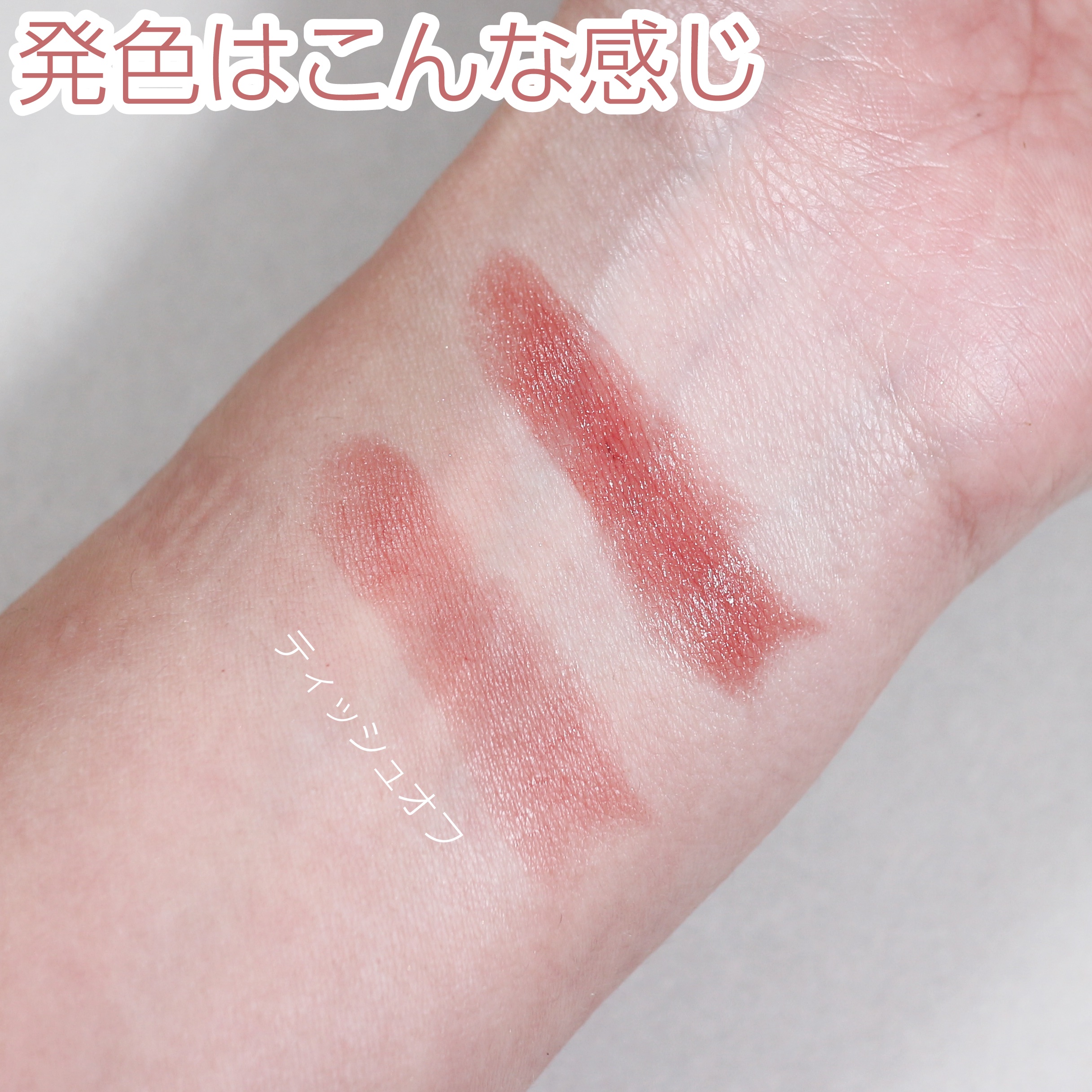 オイルとワックスの組み合わせ技術により、なめらかに伸び広がる心地よいテクスチャーに! ロングラスティング&二次付着防止処方 水分を含むとゲル化するモイストフィックスオイルが、唇の水分でジェル状の膜を形成。 粘膜の延長のようなベージュピンク ピンク強めでほんのりベージュ味あり しっかりしたテクスチャーで ザ•口紅のような塗り心地! うるおいがあって縦皺が目立ちづらい*✨ ティントじゃないのでご飯を食べると 落ちやすいけど飲み物飲むぐらいなら 色も落ちづらくて、落ち方も汚くないです