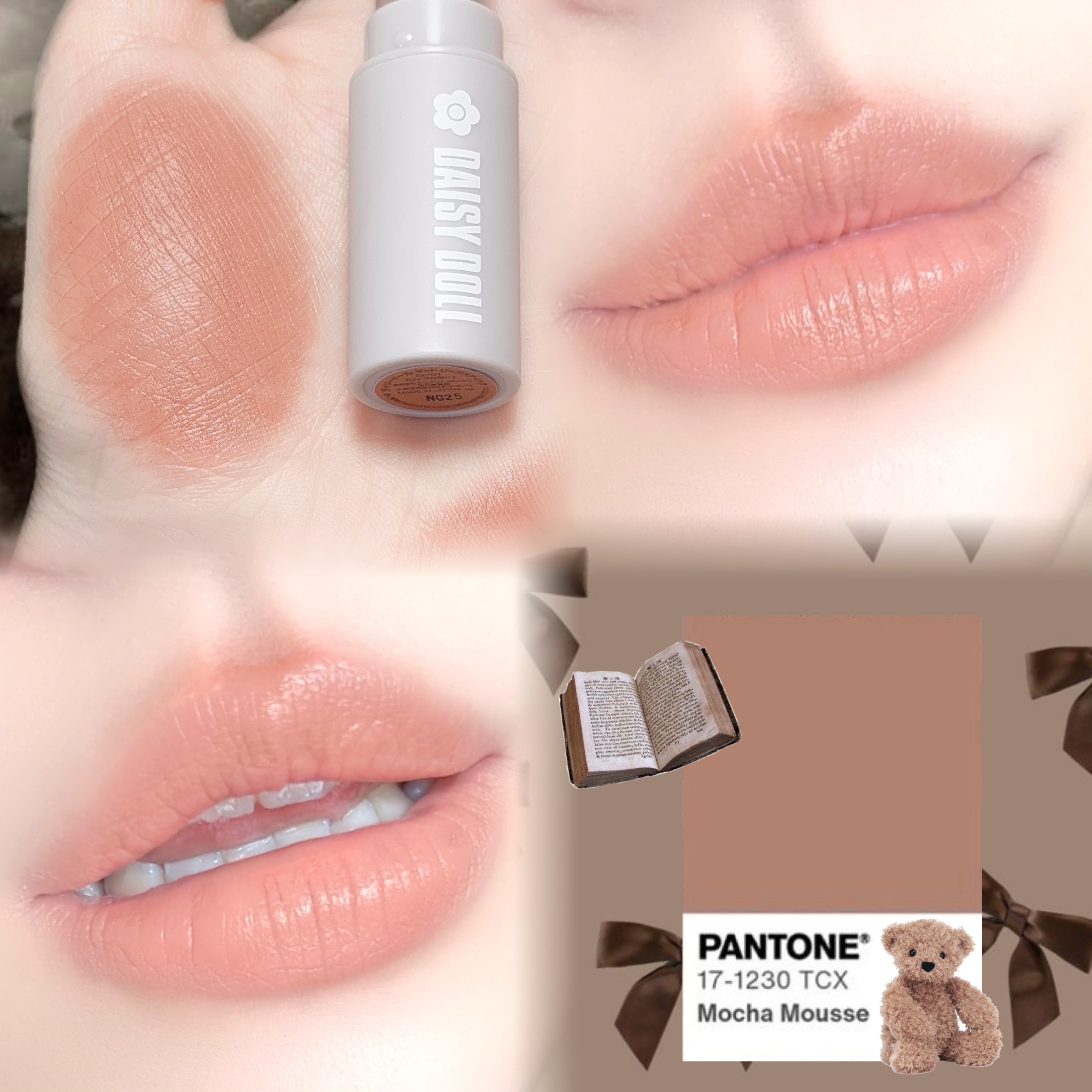 美容成分のおかげでマットなのに潤い感たっぷり! 4時間喋りまくっても、リップクリームを塗りたくならなかった😳 スルスル滑らかに塗れるしムラになりづらいから、普段は艶リップ派の方にもおすすめできそうです🧚🏻♀️ マットなので色持ちもしっかりしてくれますよ〜✨ 穏やかなオレンジベージュ系。人によってはブラウンっぽくも発色しそうです。大人っぽい落ち着きがあります。 イエベに幅広く刺さりそうですが、特にWarm-Autumn・Muted-Autumn・Warm-Springにおすすめしたいと思いました☺️ 深みのあるブルベのブラウン。私には紫っぽさがしっかり出ました!特にCool-Winter・Deep-Winterにおすすめ🍇 薄めに塗ればもっと似合う方が増えると思います!ブラウンを使いたいブルベに♡ デイジードールはマリークヮントの2ndブランド。2021年7月に立ち上げられたそう。 さらっとした手触りのパッケージは指紋が目立たないのも嬉しいところ🫶🏻 ブランドのアイコンであるデイジーが程よいアクセントになっていて大人かわいいですよ〜♡