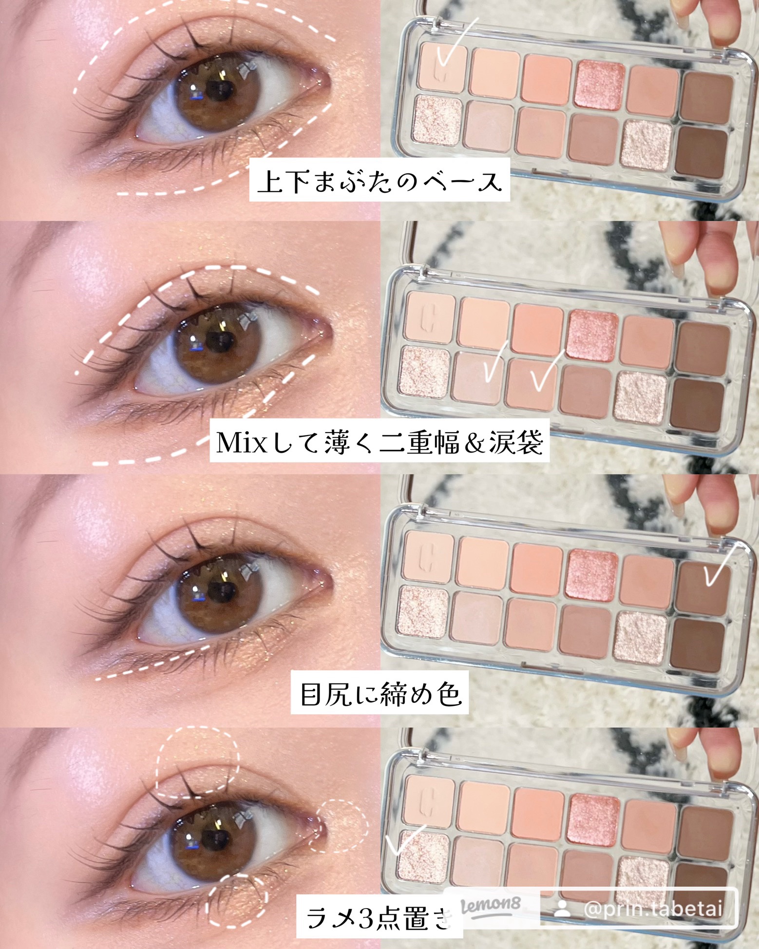 冗談を使うと華やかコーラルメイクに、下段を使うとナチュラルだけど盛れる陰影メイクに! ラメを使ったキラキラメイクもかわいくて大好きですが、マットアイシャドウの可愛さを再認識させてくれるパレットでした💭 ①a+bをアイホール全体と涙袋に塗ります ②b+cを二重幅くらいに塗ります ③e+j(e強め)を上下目尻側3分の1くらいに塗ります ④fで下まつげの隙間を埋めます ⑤hをアイライン風に塗ります ⑥お好みでラメを乗せます