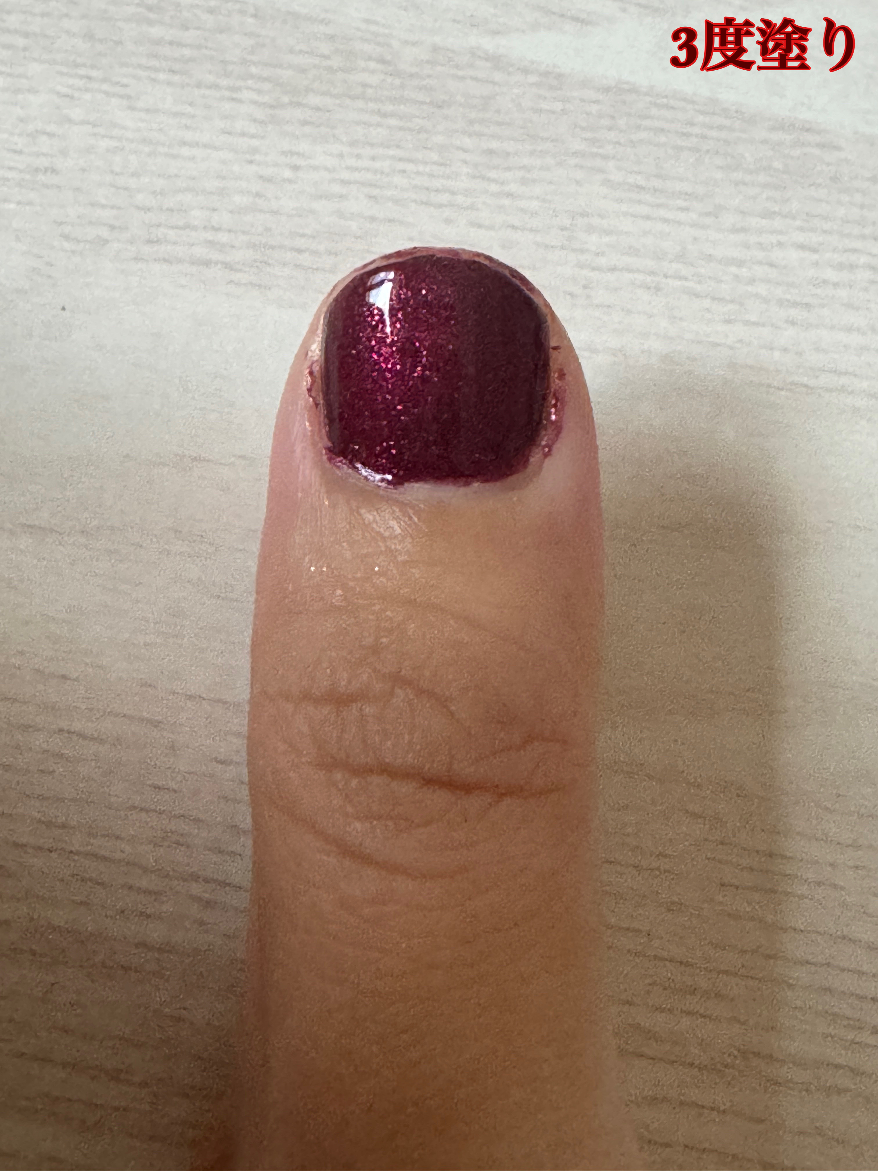1度塗りからでもしっかり色ついてくれて2度塗りからはよりボルドーよりに仕上がり、3度塗りではさほど変わらないです。 今回のホリデーの中で1番発色が良いネイル✨️ 1度塗りだとレッド味強くて2度塗りだとボルドー味が強いかな?🤔 こういうネイルはこれから寒くなって来た時にニットの服と合わせたくなりますね☺️