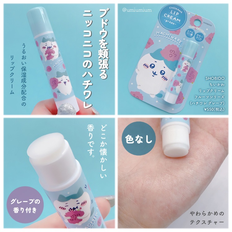 まずはハチワレのお顔がふたになっている ちいかわマスコット付きリップクリーム。 こちらはうるおい成分配合でサボンの香りつき! 香りはかなり優しめです♡ お次はちいかわリップクリームフルーツシリーズ。 ハチワレはグレープの香りつき🍇 パケにはブドウを頬張るニッコニコのハチワレが♡ 最後にお洒落なパケの ちいかわLovisiaリップクリーム。 こちらは紙のパケ。 パステルカラーのハチワレイラストが可愛い✨ キャップをとると中にもハチワレプリントが😍 なんと4種の保湿成分配合です。 (レモンエキス*1・ザクロエキス・ヒアルロン酸*2・セラミド*3) ミルクチョコの香り付き🍫 これが1番香り強めかな? お菓子の香りが好きな方におすすめ!
