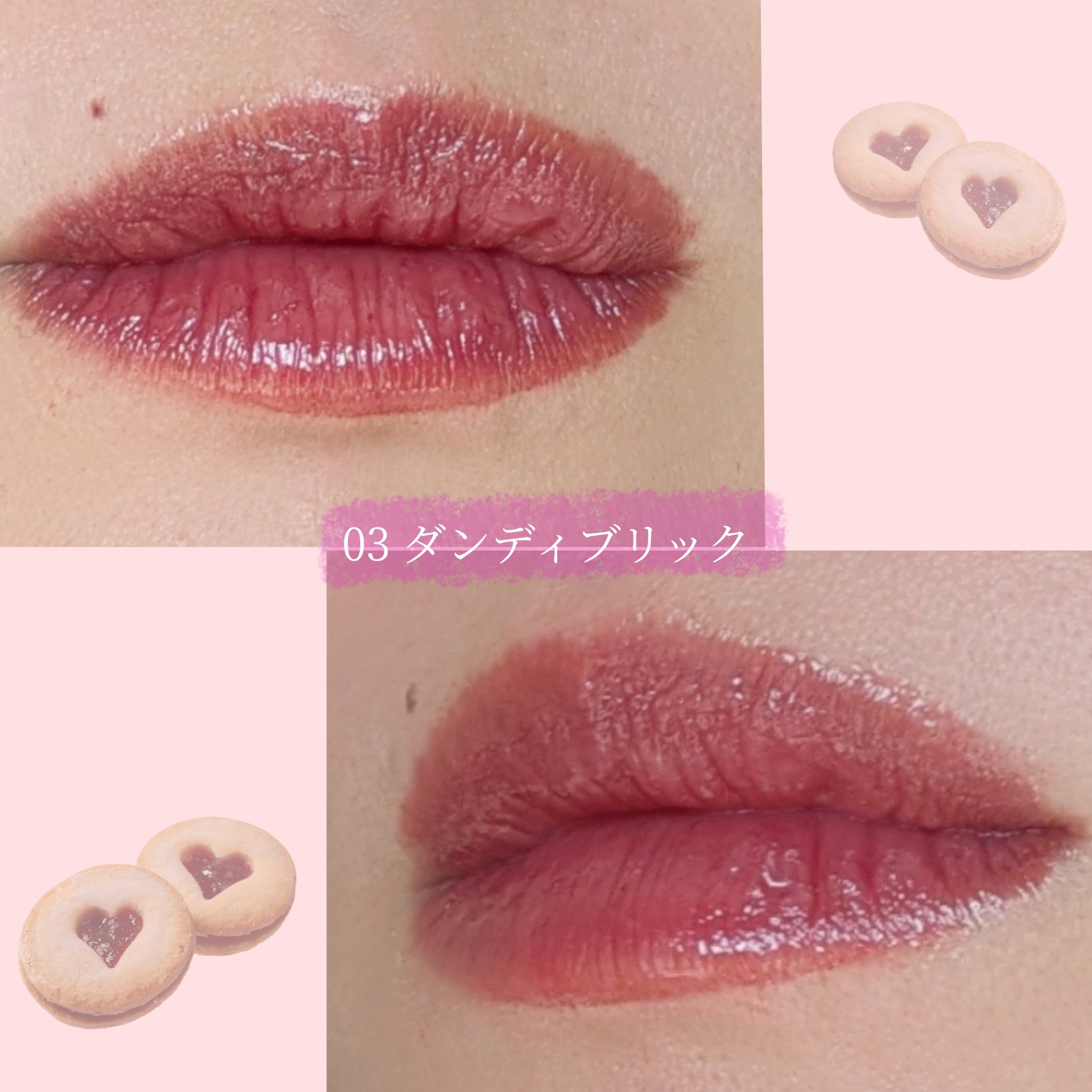 01フォーマルベージュ(ピンクベージュ)03ダンディブリック(モーヴブラウン)06ムーディーローズ(くすみローズ)09Y2Kフーシャ(透け感青みピンク)艶々のオイルグロスティント時間がたった後の方がパケの色に近いです。発色がかなり良くて私には...