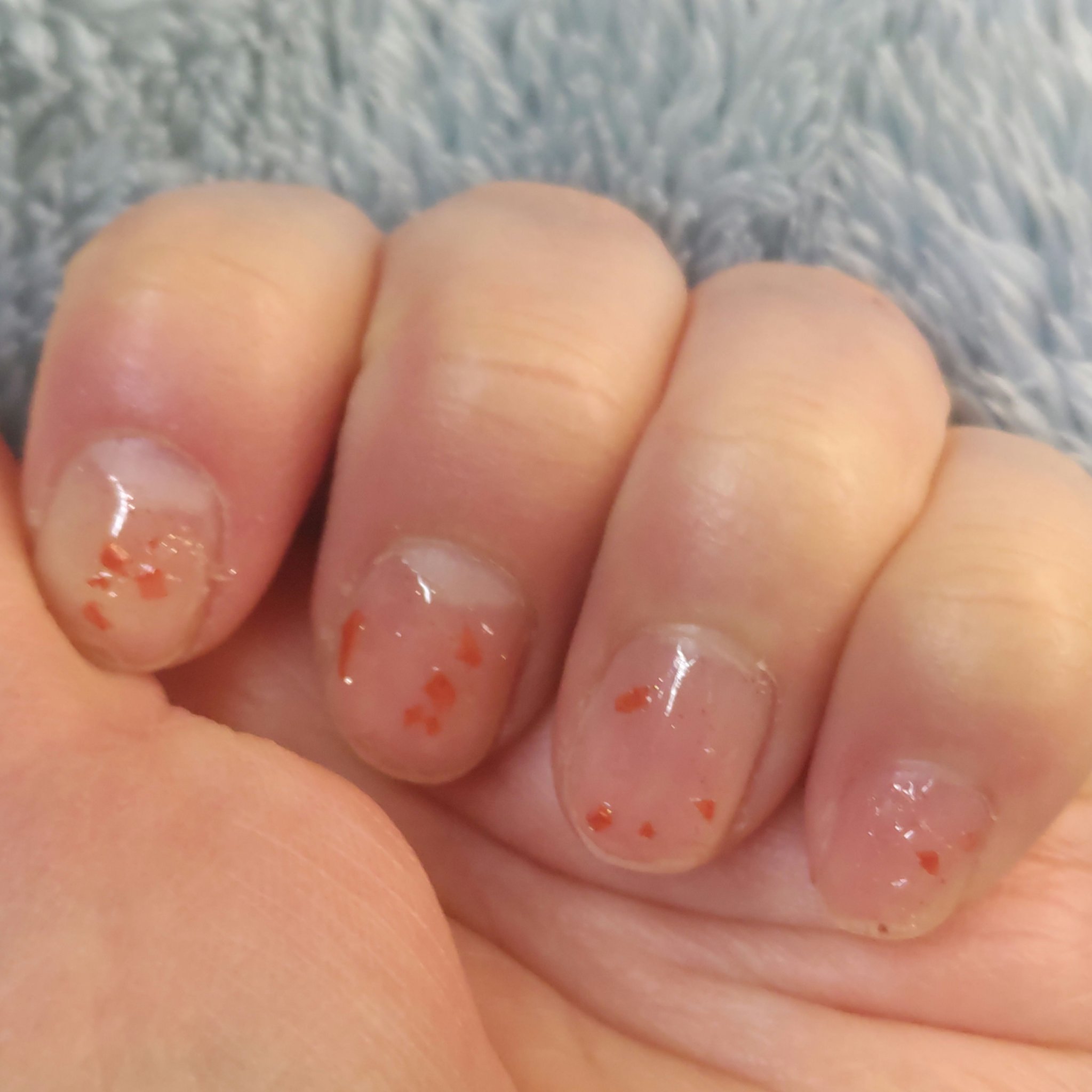 パラドゥミニネイルOR05 ルーセントフラワー購入して使用しました。ワンポイントになって可愛いです。花びらのようなラメとHPには書いてありますが、半透明のフィルムという感じです。全指に塗ってももちろん可愛いのですが、落とすのがかなり大変なので、できれば片手2本以内にしたいところです。秋のネイルはくすみカラーや暗めの色を使いがちなのでこちらがあると華やかさが増して可愛い感じになって良いです。#パラドゥ#parado_パラドゥ_ミニネイル#ルーセントフラワー #セルフネイル