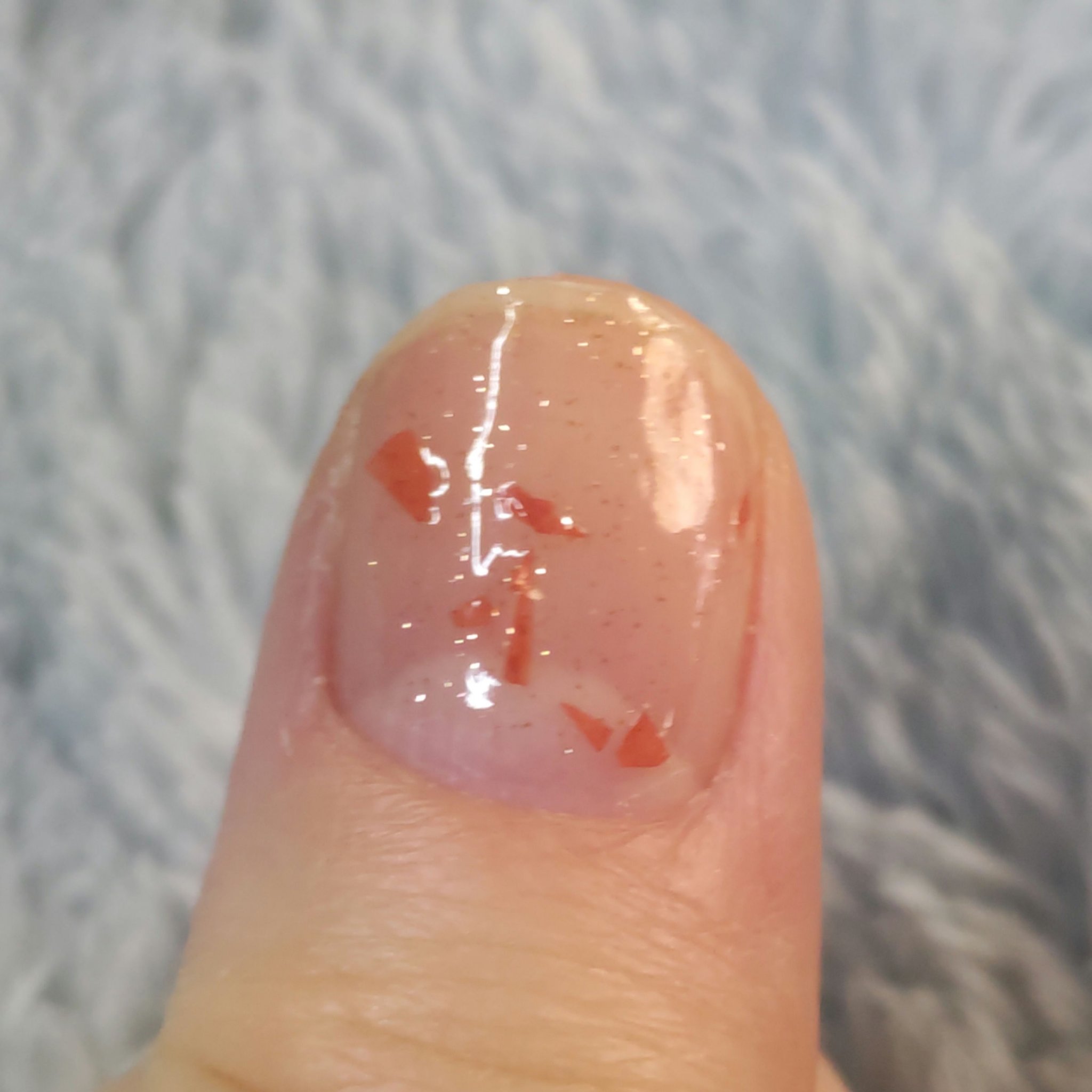 花びらのような様々なサイズのオレンジのフレークとゴールドラメの入った可愛らしいポリッシュです。 他にない色だったので買ったのですが、ハケの隅がバキバキに折れてしまっていて普通に塗ることが出来ない状態だったので評価を下げました。 製造工程でハケをボトルに入れる際失敗してボトルにハケが引っかかったのだと思います。 アセトンでハケについているポリッシュを落としてからウッドスティックを使って折れをなるべく真っ直ぐにはしましたが完全に直るわけがなく…。 とても可愛い色なので残念な気持ちになりました。 欲しいところにポンポンとフレークを取って爪に載せる使い方のほうが多そうなのが唯一の救いです。