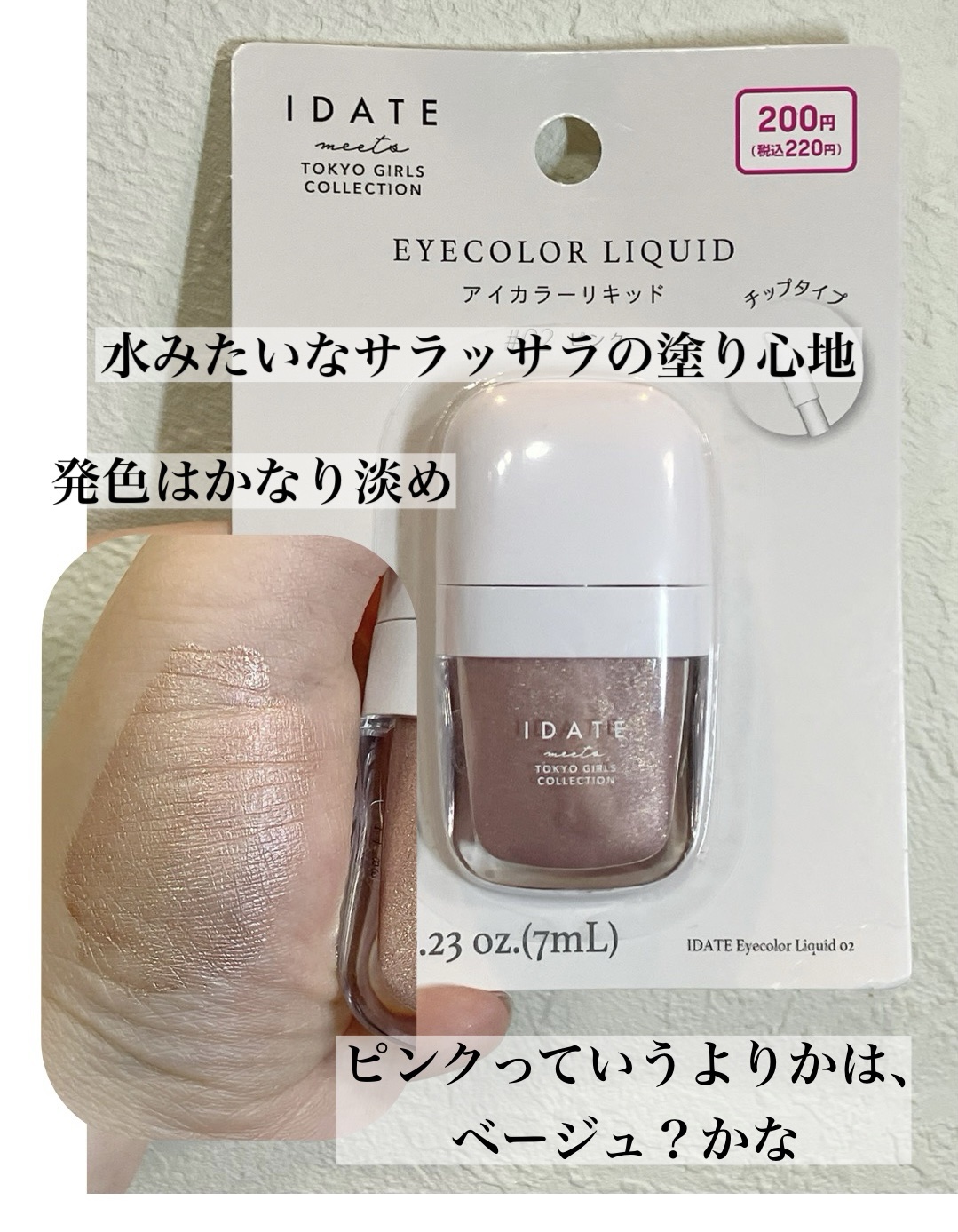 IDATEアイデイトアイカラーリキッド02220円使い方↓↓↓アイホールに塗りやすい、チップタイプです。メリット薄づきのピンクがアイメイクを、強調し過ぎず良い感じに馴染ませてくれます。私も愛用している商品です。東京ガールズコレクションとコラボした商品です。チップタイプなので、塗りやすいです。手が汚れません。デメリット痒くなる時もあります。使ったら、アイメイク専用のリムーバーで落としましょう。#IDATE#アイデイトアイカラーリキッド