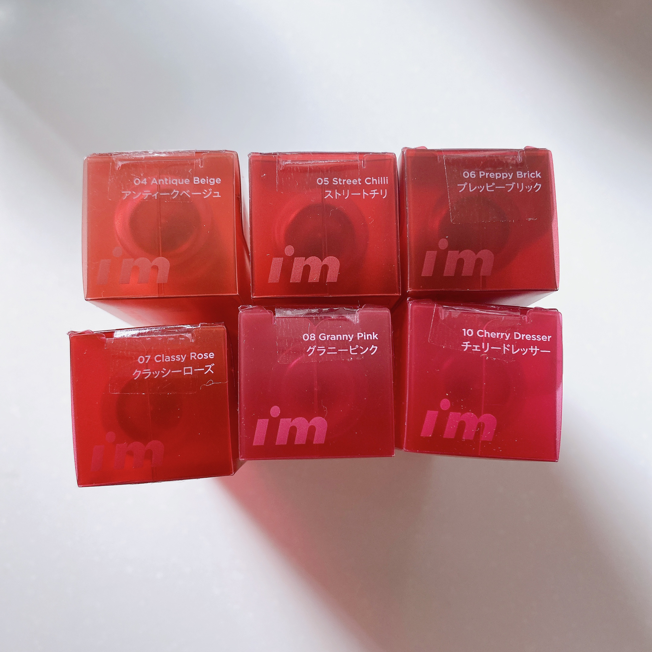 i’mmemeリップシルエットマットベルベットティント/04 アンティークベージュ 素肌感ミルクベージュ05 ストリートチリ 絶妙オレンジブラウン06 プレッピーブリック 赤みブラウン07 クラッシーローズ くすみローズ08 グラニーピンク モーヴピンク10 チェリードレッサー 甘めチェリーピンク高発色&高密着マットなのにかさつかないふんわり柔らか軽い質感のベルベットティント