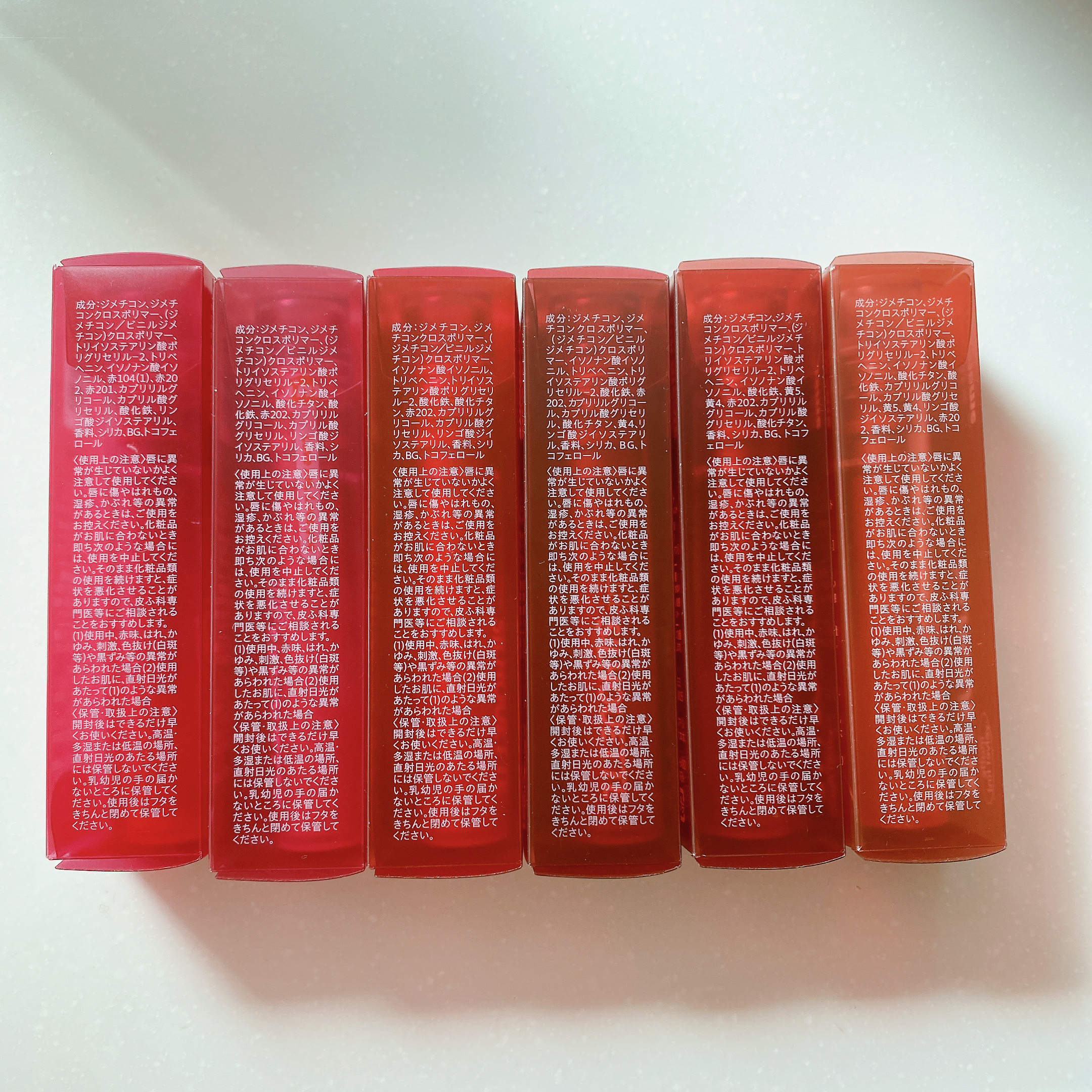 ①柔らかなベルベットマット質感 唇がふっくらと仕上がる ②今トレンドのオーバーリップメイクにも ③塗布するのに最適な 斜め角度の毛足の短いチップを採用 ベースに薄め、内側に濃いめカラーの 2色使いもオススメ!! イエベの私は04から07がしっくりくる 感じがありました!とくに06プレッピーブリックが ドンピシャで好みの色味でした! パケも色味によって異なっていてわかりやすい! そして個人的に嬉しいのが外箱の裏の ()内の色表現です。 言われればわかるけど、言われないとこの色が 何よりの何色なのかわからないので…泣 このように記載されているとなるほど、これね!と 納得できて楽しいです!😊 ティッシュオフしてもしっかり定着して オイルクレンジングでもうっすら残ってるように 感じたのでかなり色持ちはいいのではないかなと 思いました!!